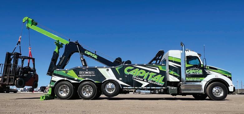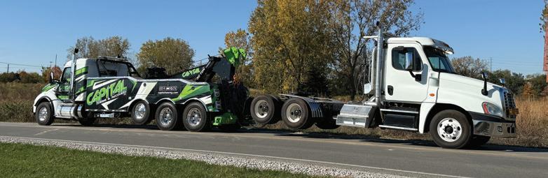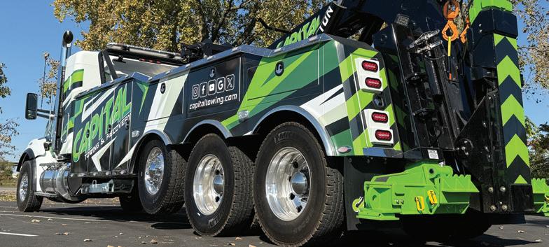 more than 100 pieces of equipment and around 60 power units. The new look was produced by Best Graphics in Westerville, Ohio, which also wrapped Capital’s newest unit, the Custom Built 30ton wrecker shown here. ◀