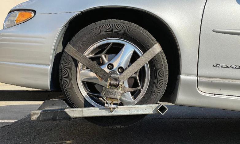 to most wheel-lift securement straps. Use both wheel securement straps on every tow. Often tow operators towing a vehicle down the roadway use only one wheel securement strap. This is not a safe and secure tow. In a hard stop or collision, the towed vehicle’s wheel on the unsecured side may roll forward and off of the wheel-lift grid. It may also cause the wheel securement strap on the secured side to come loose, resulting in a failure of the primary securement.