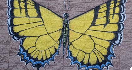 ter, Jenn Sharpe, who owns the salon. The butterfly artwork, featuring yellow wings tipped in blue, has become a popular photo spot but carries a reminder of the importance of Michigan’s “Move Over” law.
