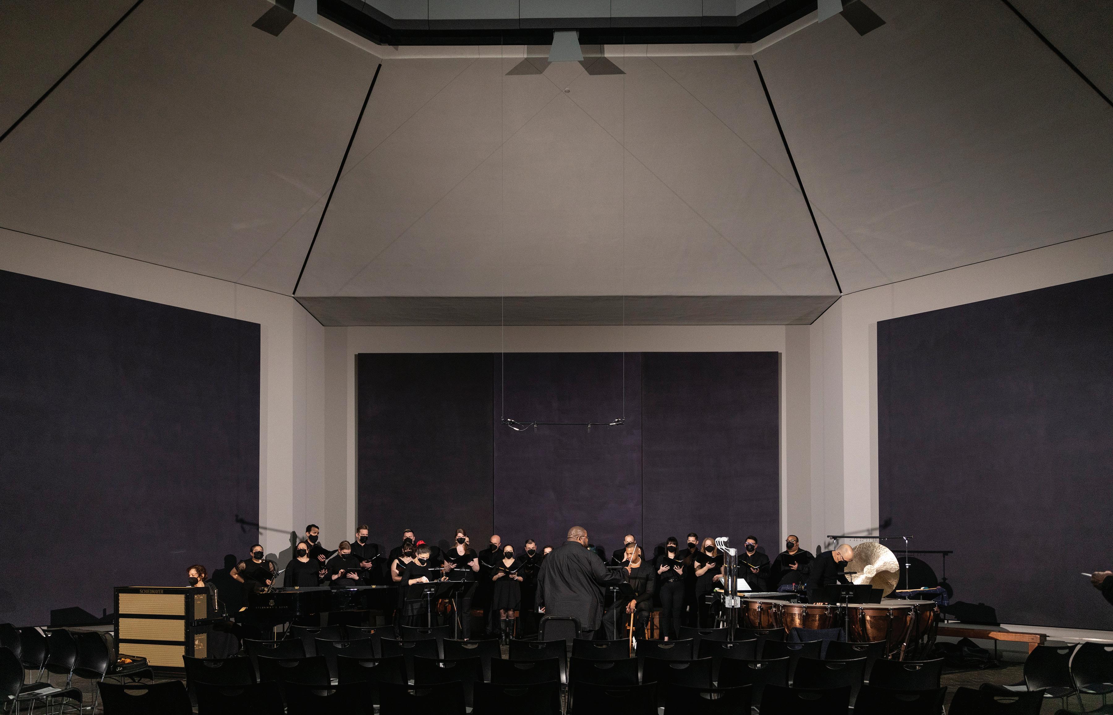 We performed the world premiere of Monochromatic Light (Afterlife) in Rothko Chapel in February 2022. Sorey made two modifications to instrumentation: he shifted Feldman’s female soloists to a bass-baritone, reflecting the dark tones of the Rothko canvases; and he added piano to the keyboard’s celesta. These shifts of timbre and color became key to the work’s character, pulling the ethereal sound world of Feldman’s ensemble back towards earth and human experience. As Tyshawn’s concept for the vocal soloist expanded, we quickly engaged bass-baritone Davóne Tines, whose artistry transformed the work.
