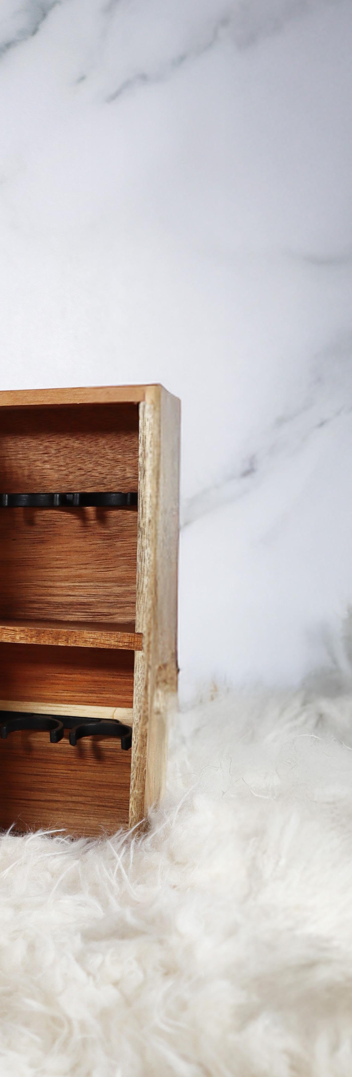 Fabricado con la resistente y característica madera de acacia, esta caja de almacenamiento se convertirá en el lugar favorito para guardar tus aceites esenciales. La caja de madera lisa tiene un aspecto elegante, así como moderno. Este tiene compartimientos verticales que se deslizan hacia fuera y permite acceder y ver fácilmente 36 aceites.
