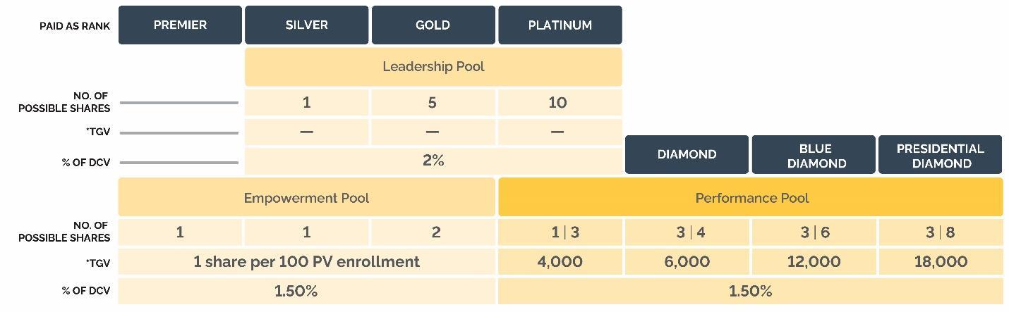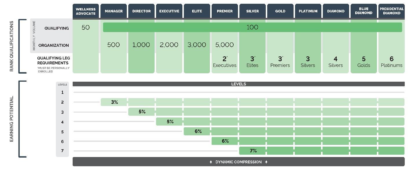 Ranks: Designations (levels) earned by and given to Wellness Advocates in the Company’s Sales Compensation Plan structure, including: Consultant, Manager, Director, Executive, Elite, Premier, Silver, Gold, Platinum, Diamond, Blue Diamond, and Presidential Diamond. Ranks are earned and determined each monthly commission period.