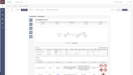 As it turns out, just as the team was about to rollout the ELN to a larger group of users, the pandemic hit. So, they shifted to online training and forged ahead, knowing that quickly getting the ELN into users’ hands would help the company immensely during the pandemic. Dotmatics ELN dashboard and chemistry reagents view