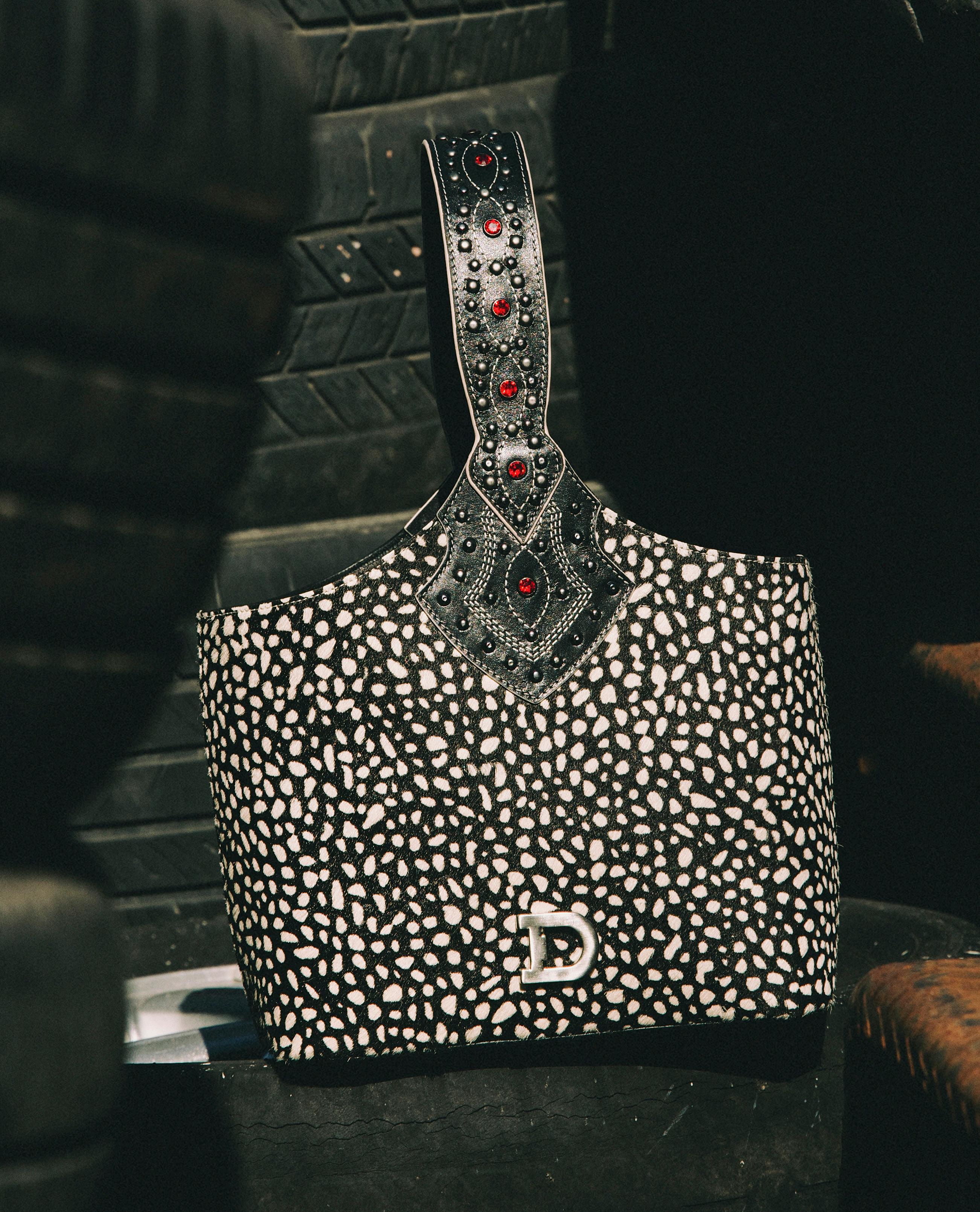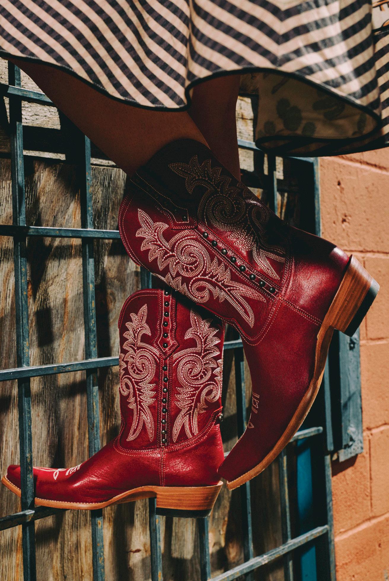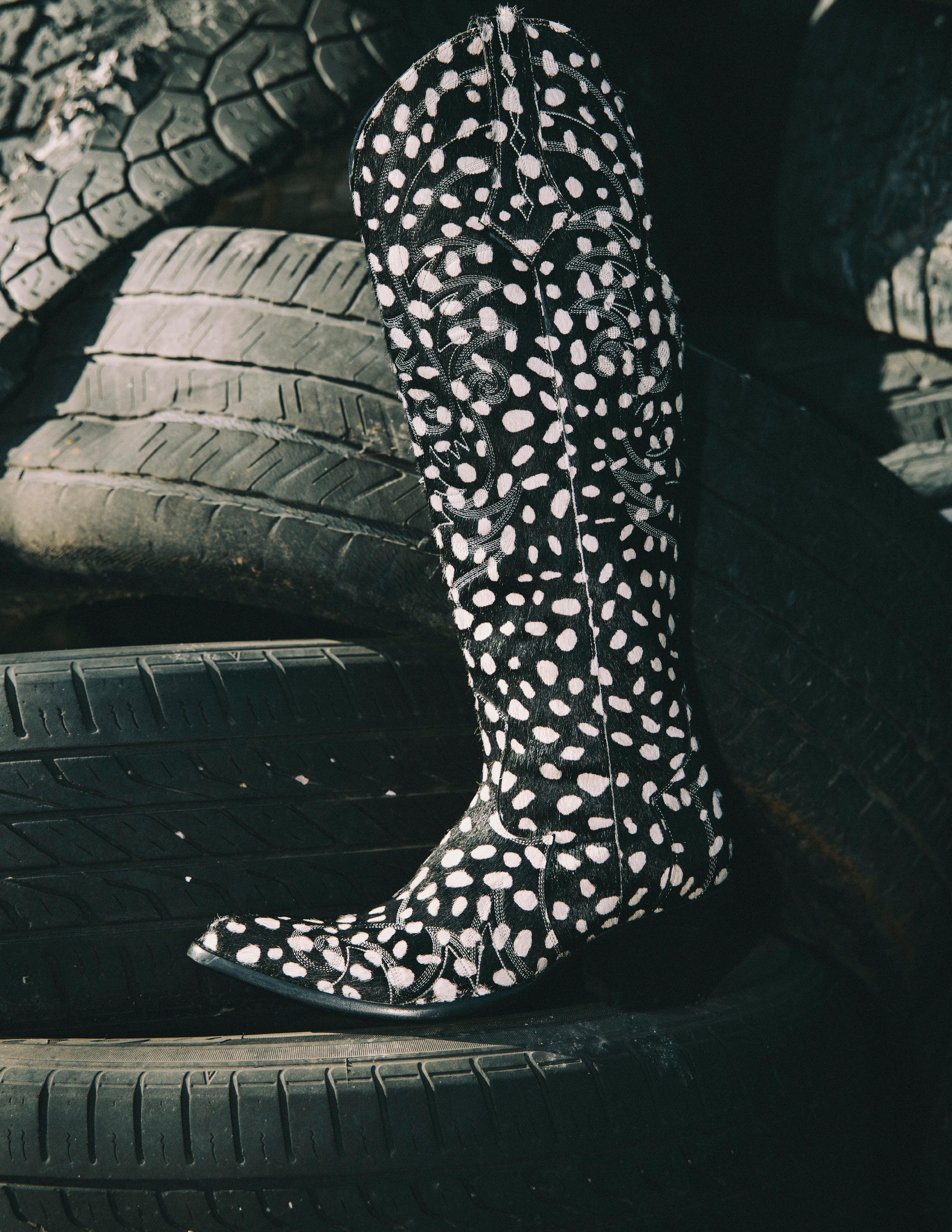 Like we mentioned, almost all of the inspiration for this collection came from a single trip of wandering around the Round Top Antiques Market. We eyed this cool vintage hair-on hide and immediately knew we could make it work in some way. Turns out, we made it work in a lot of ways, from statement shorts to a chic handbag, we added it to a new boot, and we even adapted it into a silk scarf.