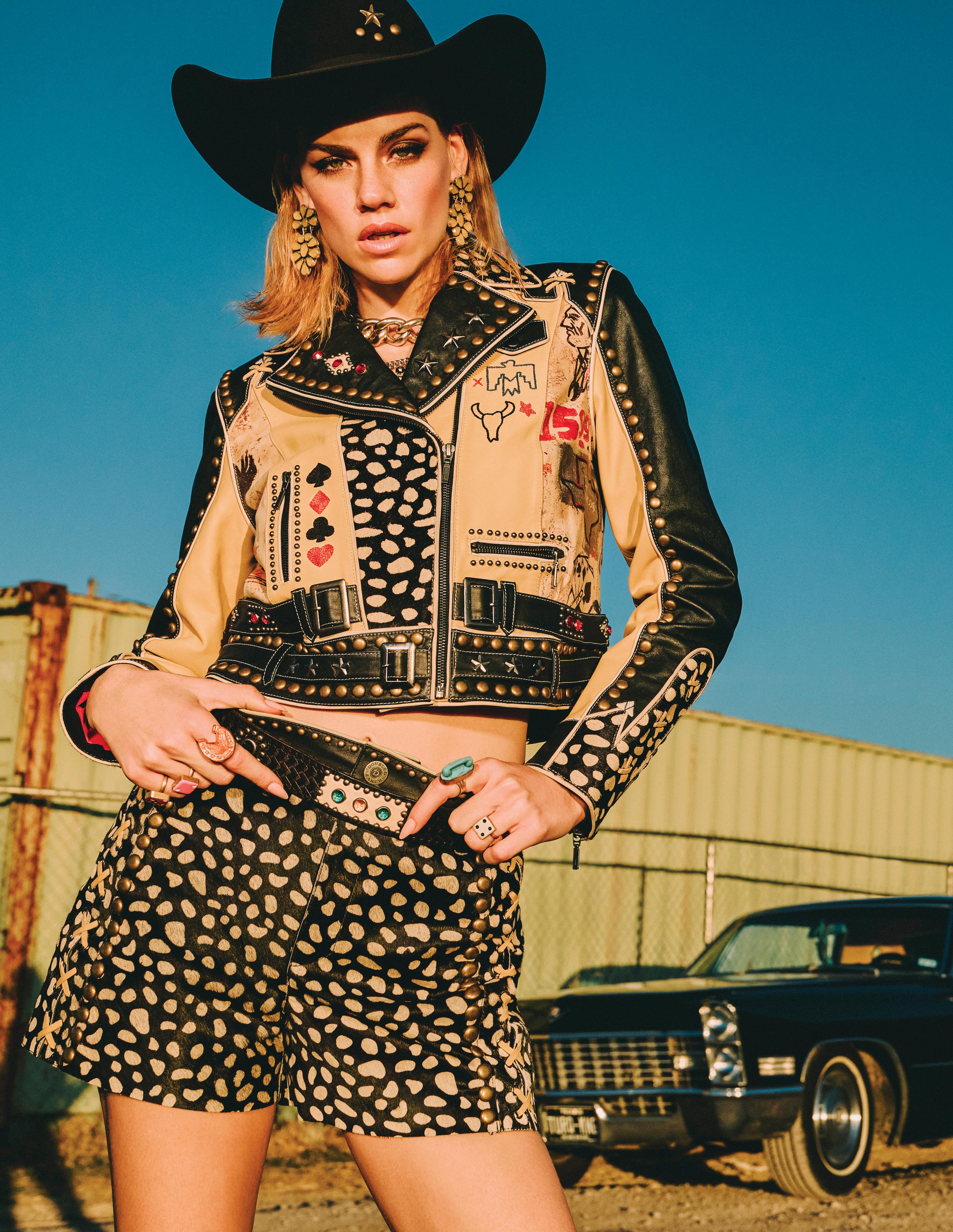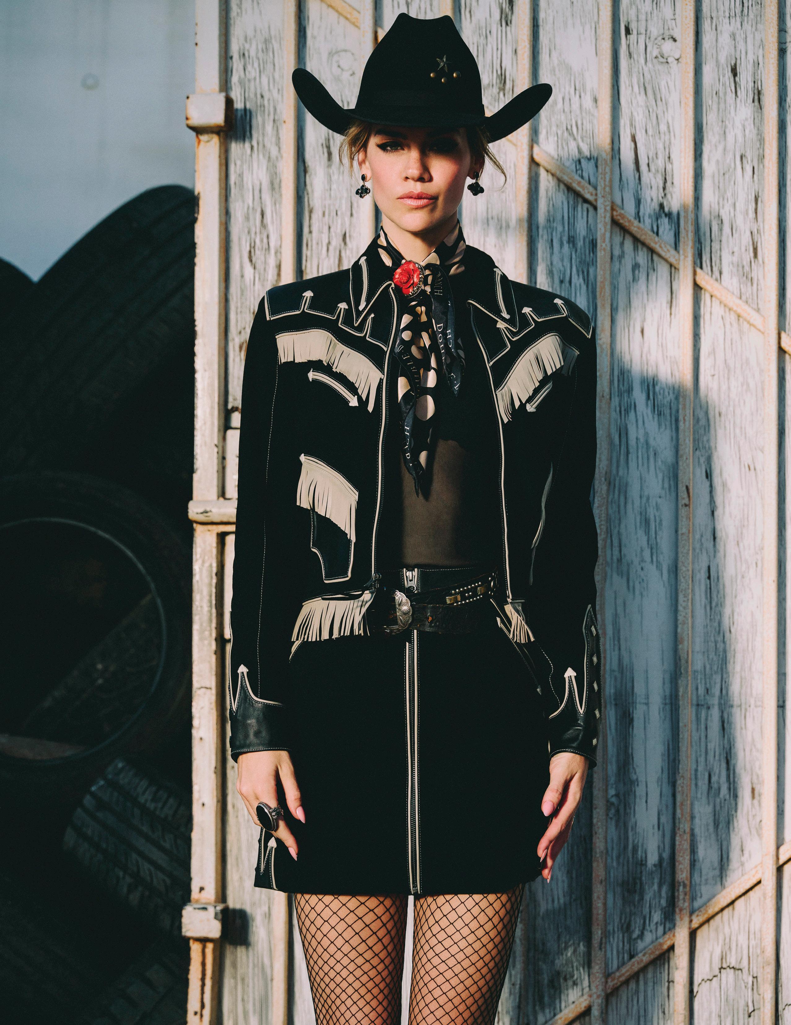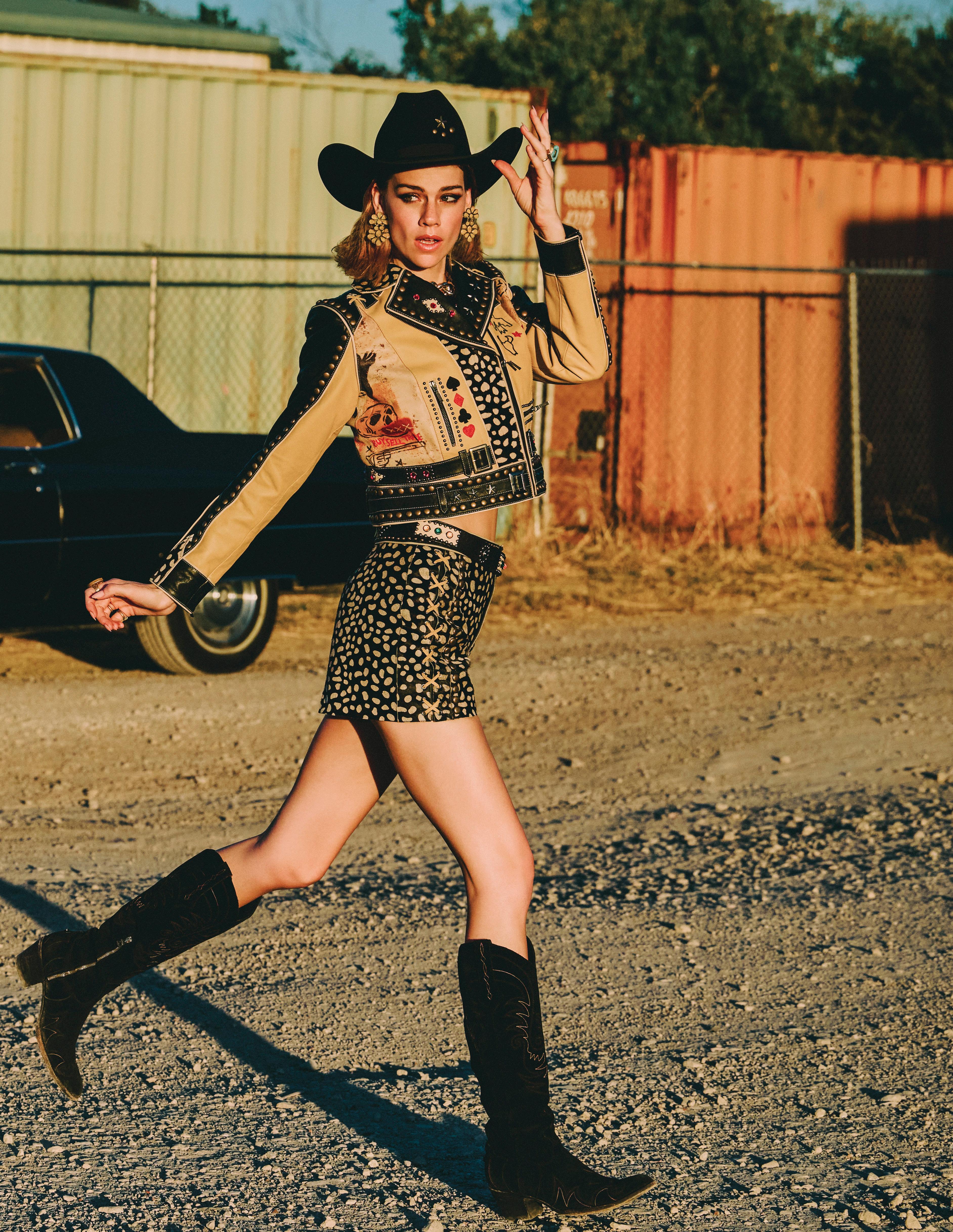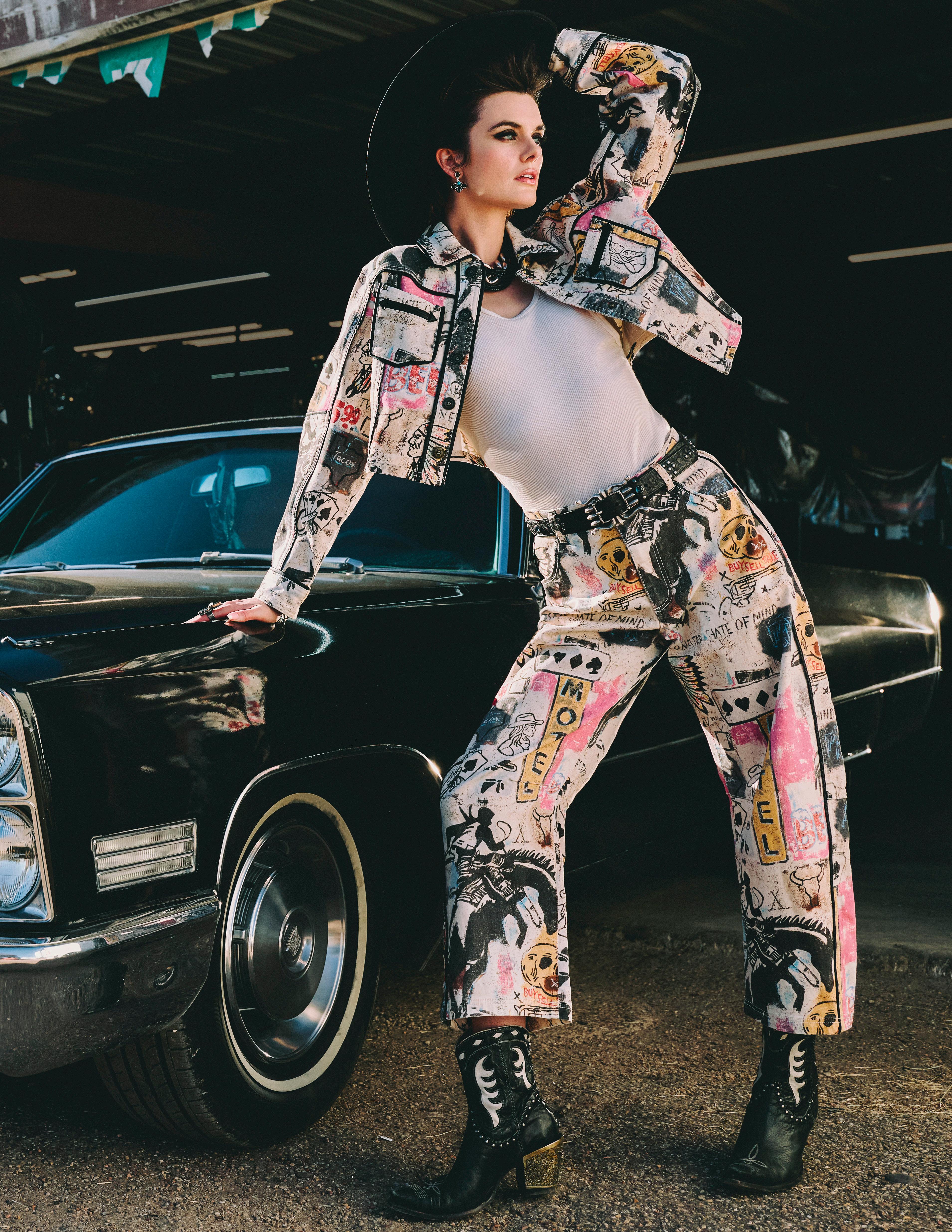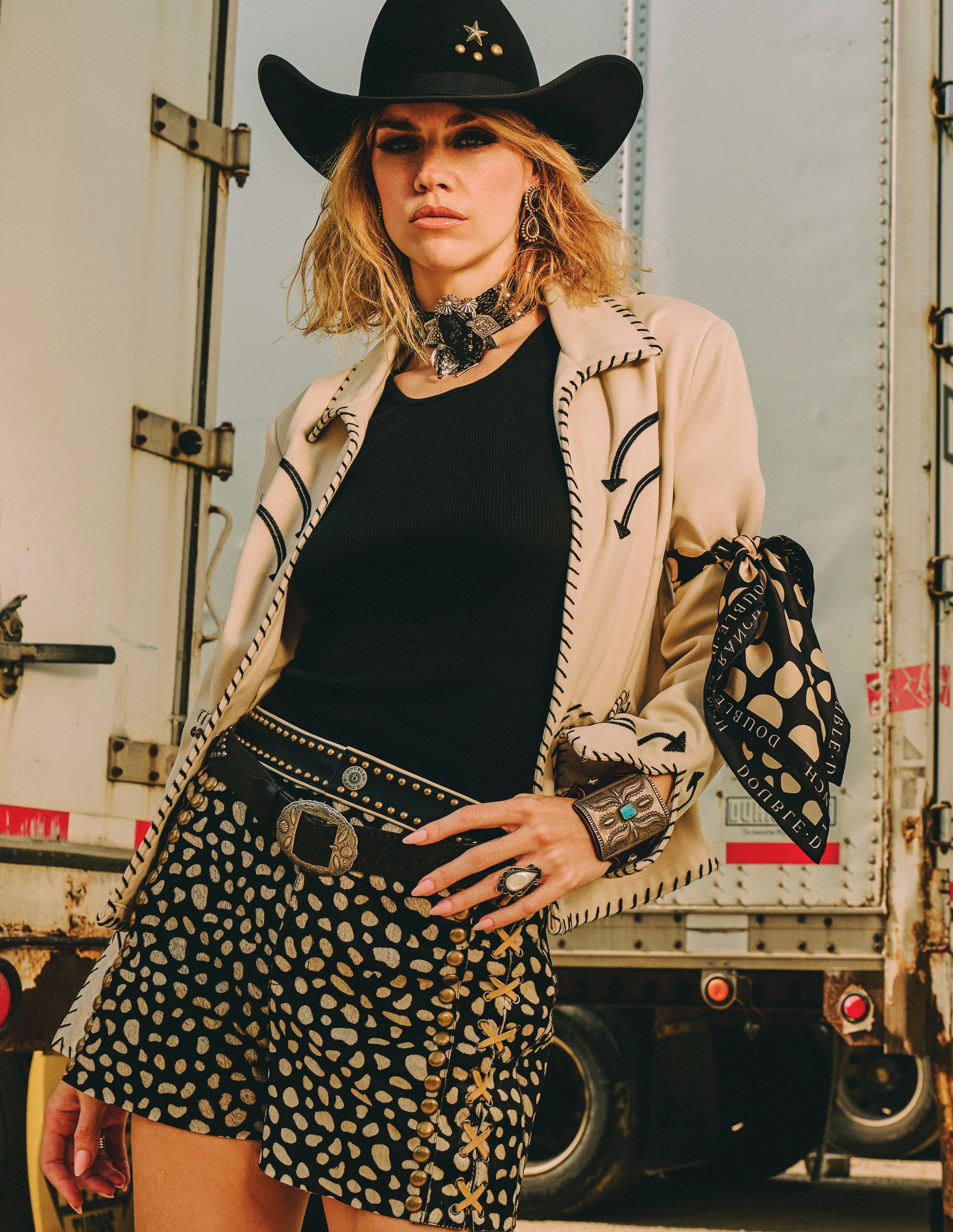 COWBOY GRAFFITI JACKET, HOWDY DOTTY SHORT, CITY SLICKER HAT, LONG TALL SALLY BOOT, OSCAR BETZ FOR DOUBLE D RANCH, DOUBLE D RANCH JEWELRY, VINTAGE DOUBLE