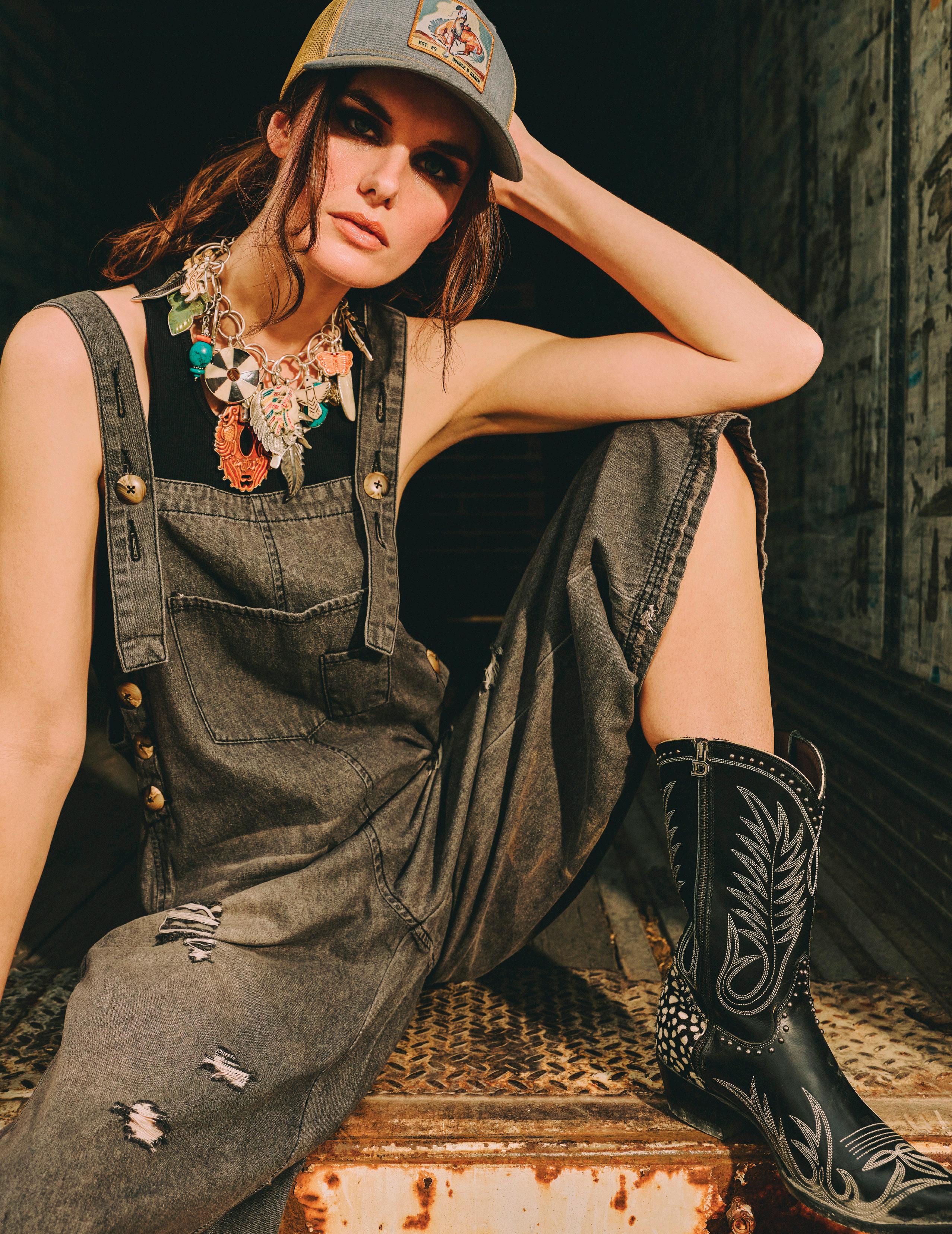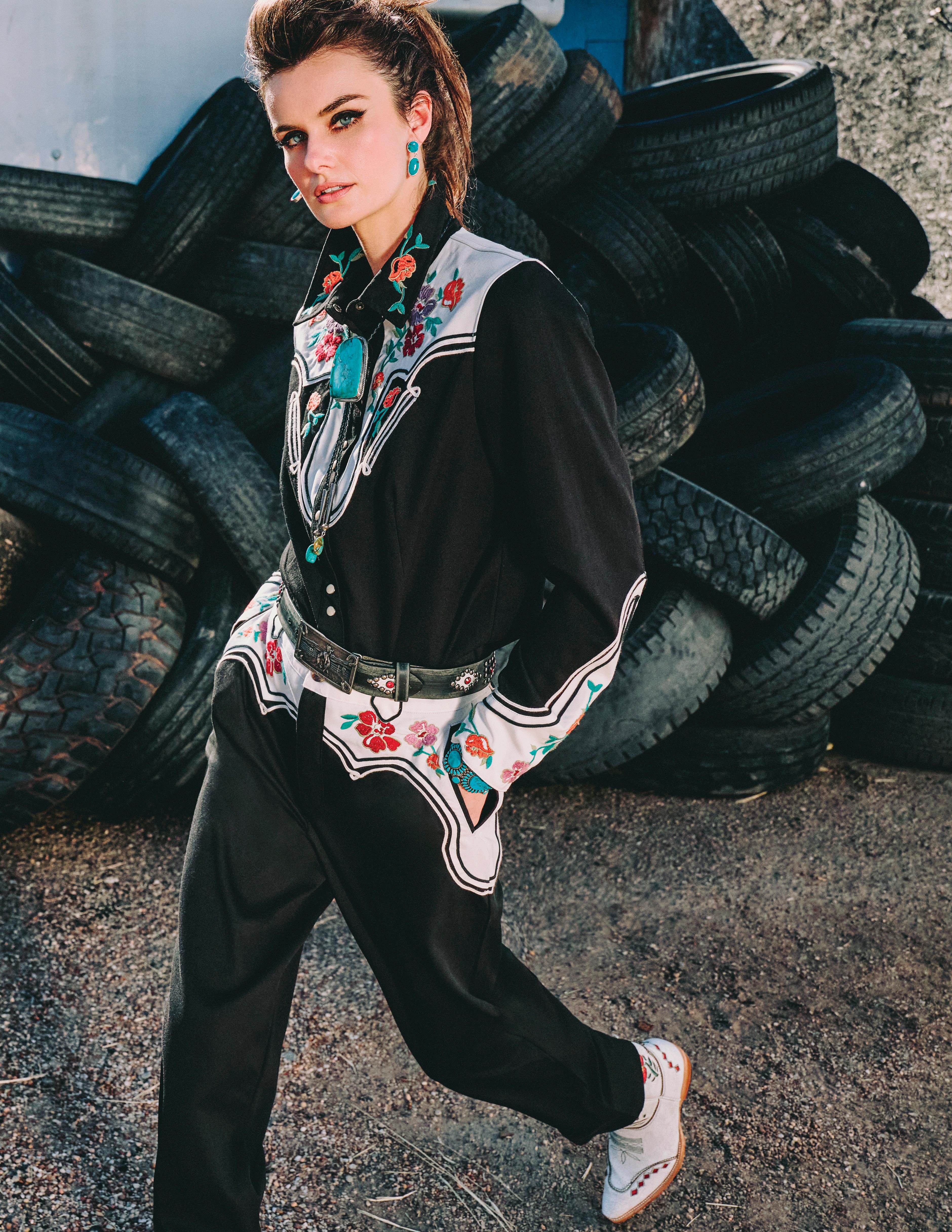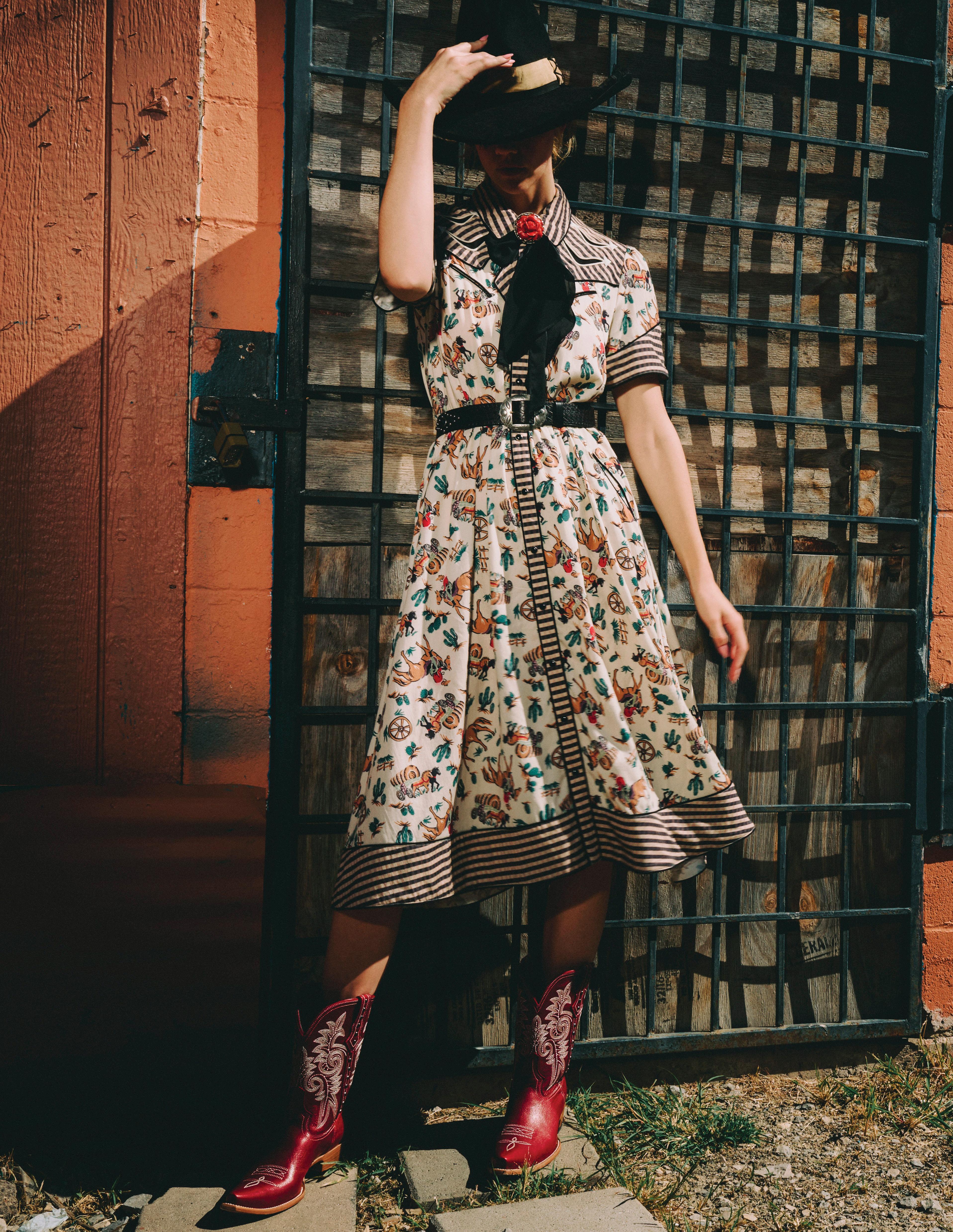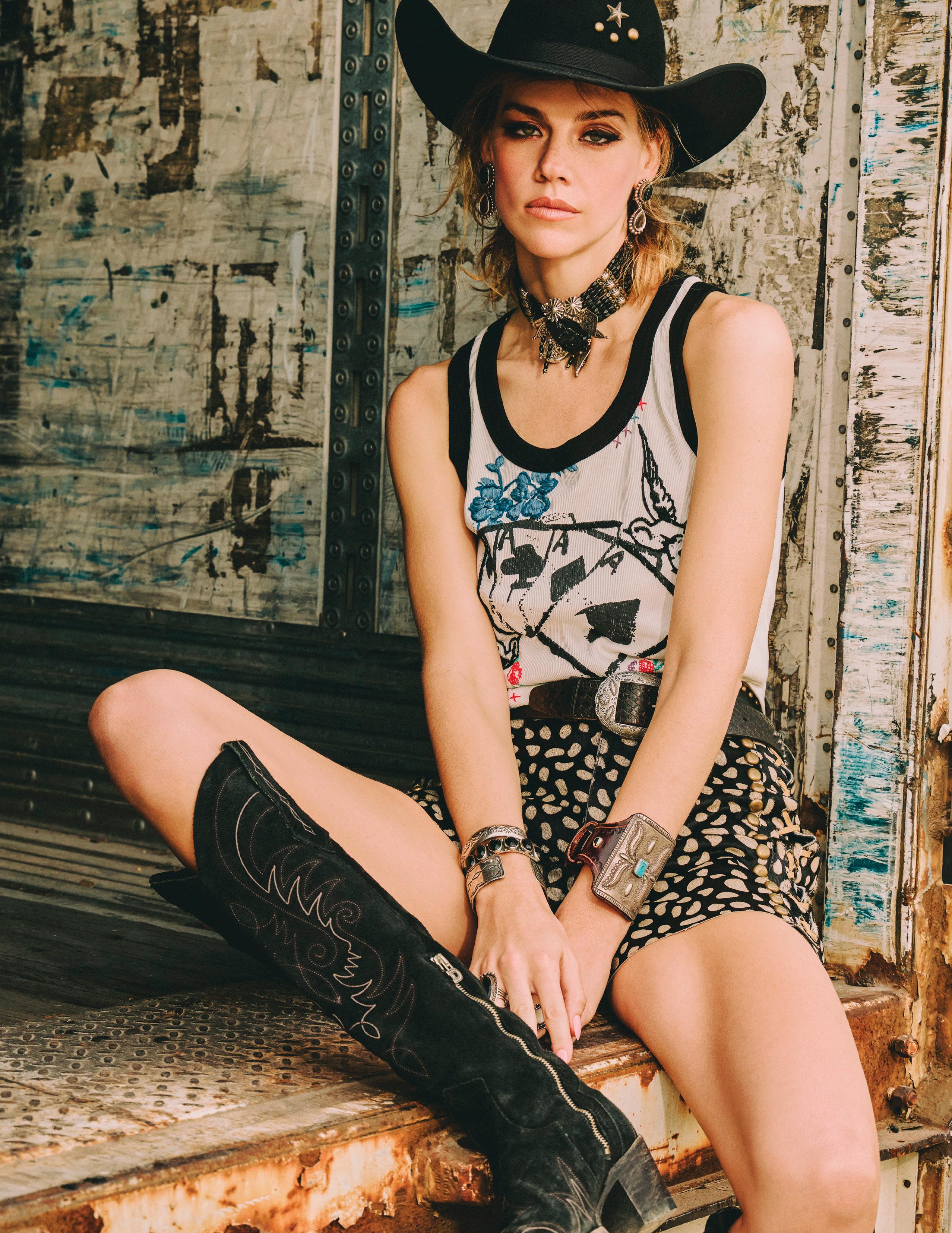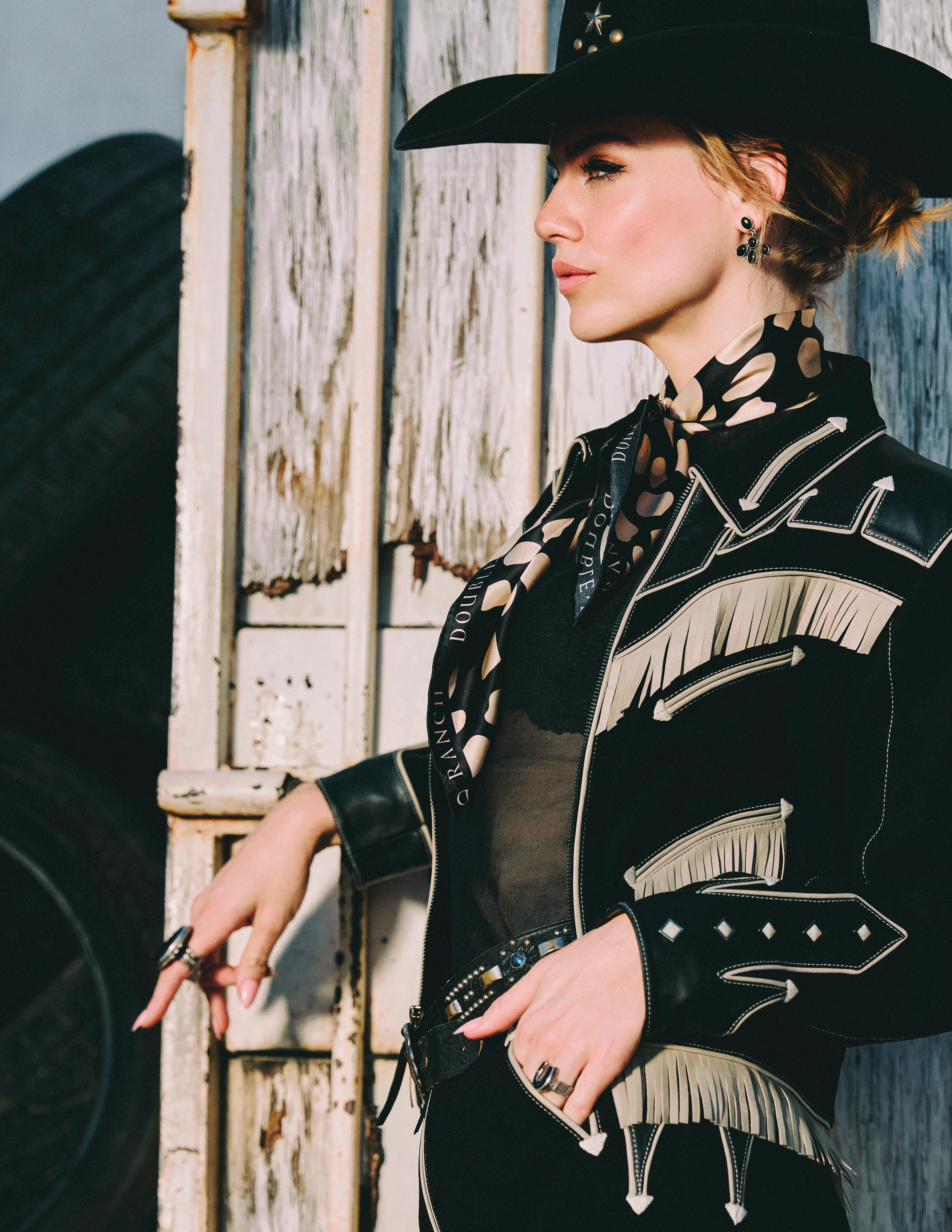 COWBOY GRAFFITI JACKET, HOWDY DOTTY SHORT, CITY SLICKER HAT, LONG TALL SALLY BOOT, OSCAR BETZ FOR DOUBLE D RANCH, DOUBLE D RANCH JEWELRY, VINTAGE DOUBLE