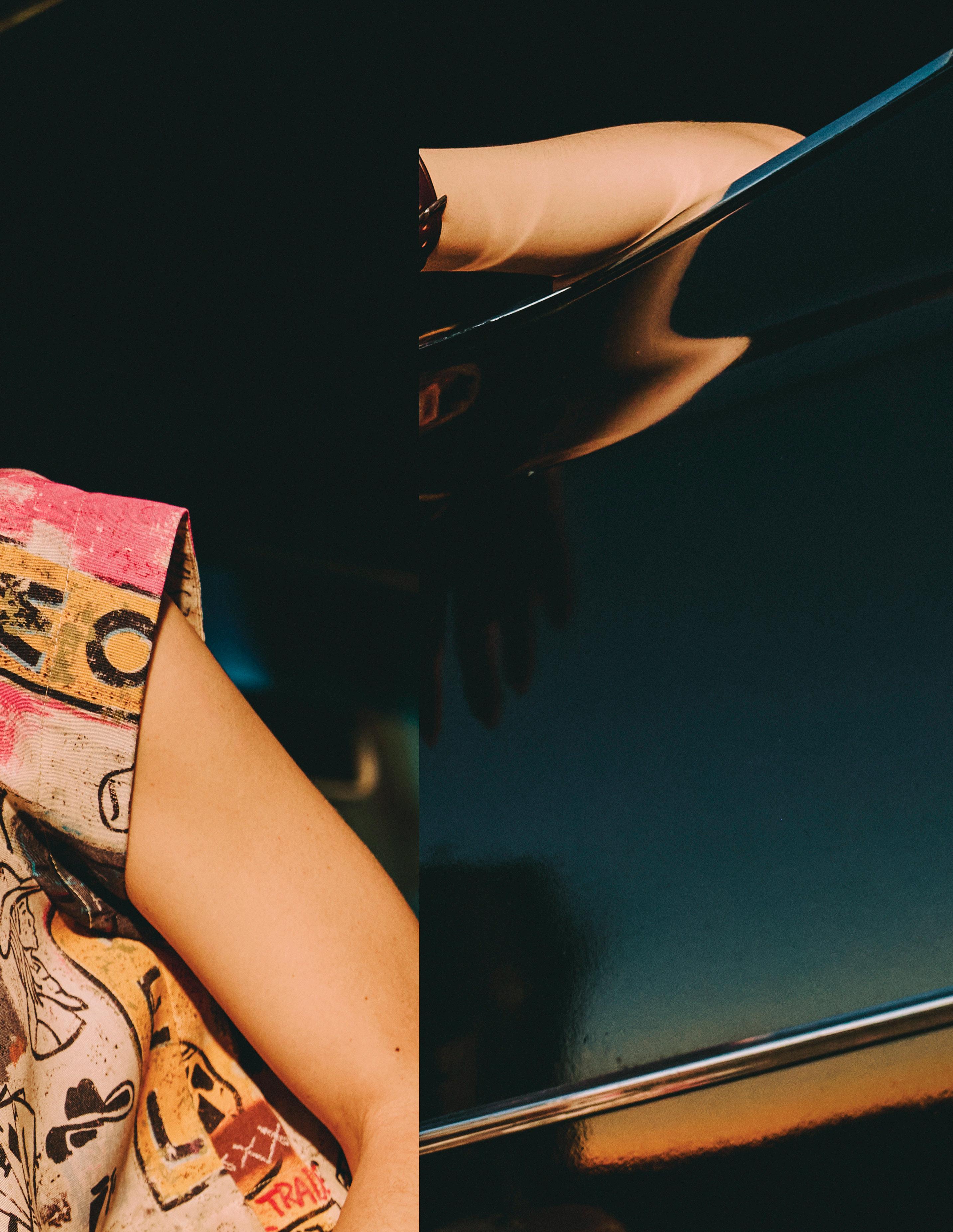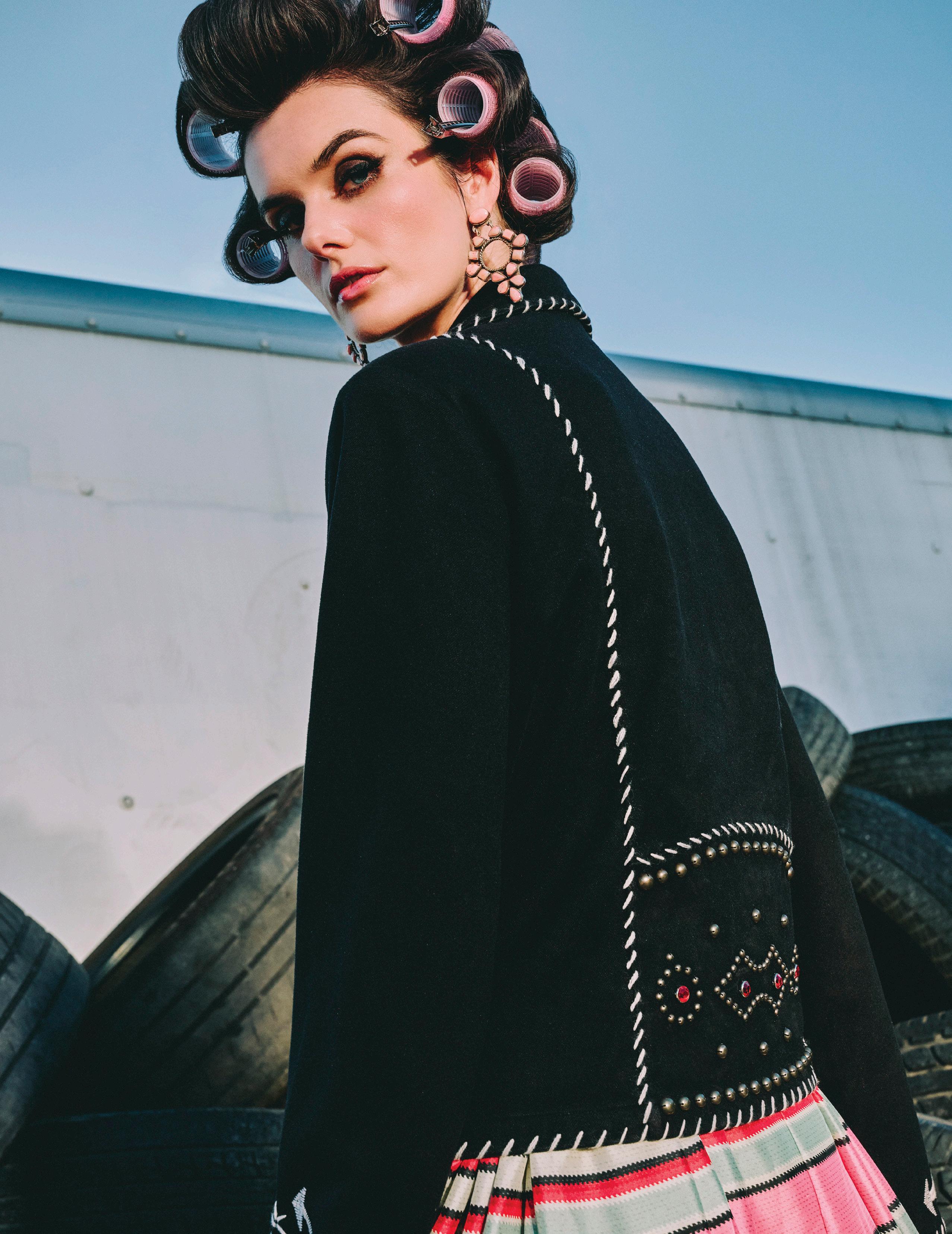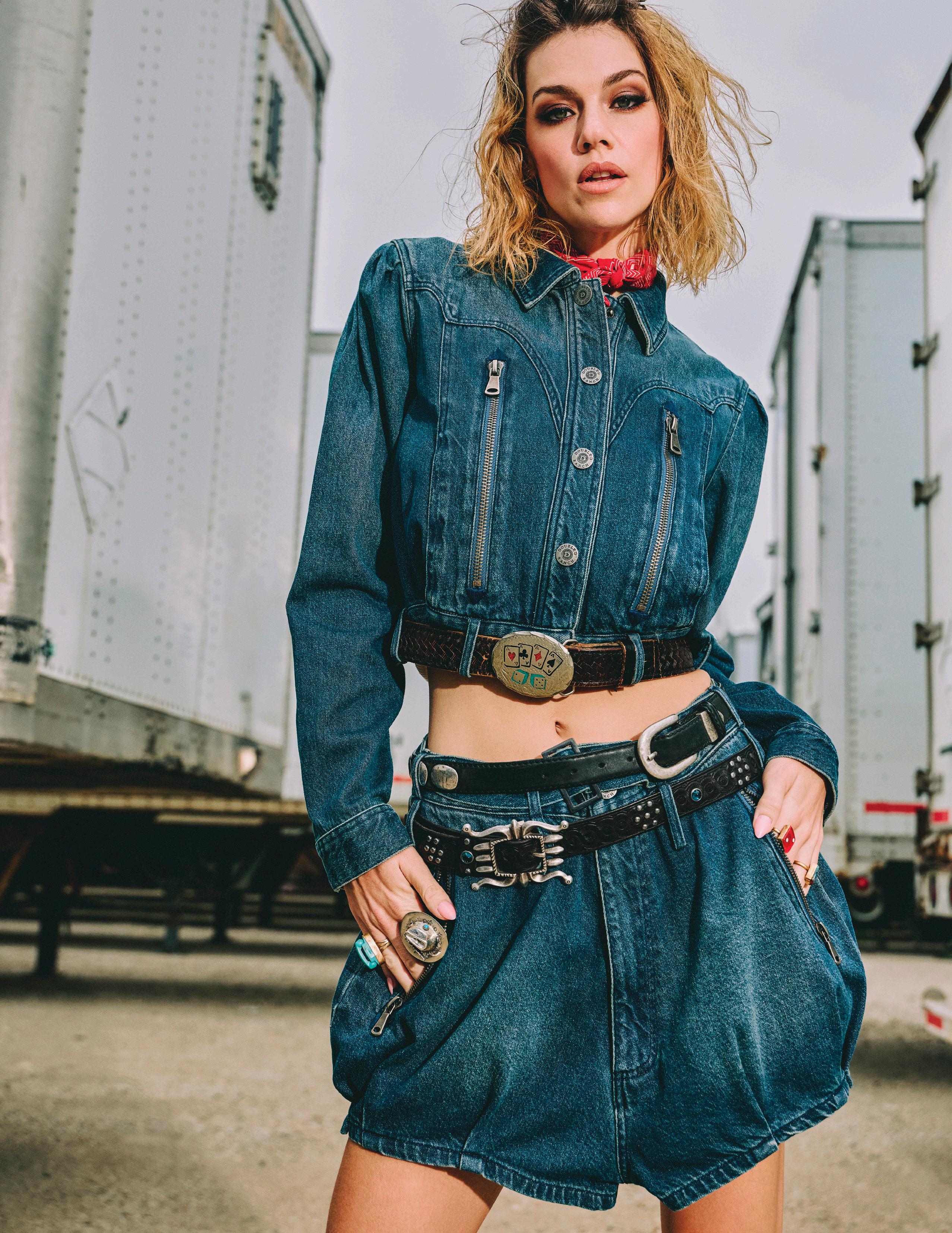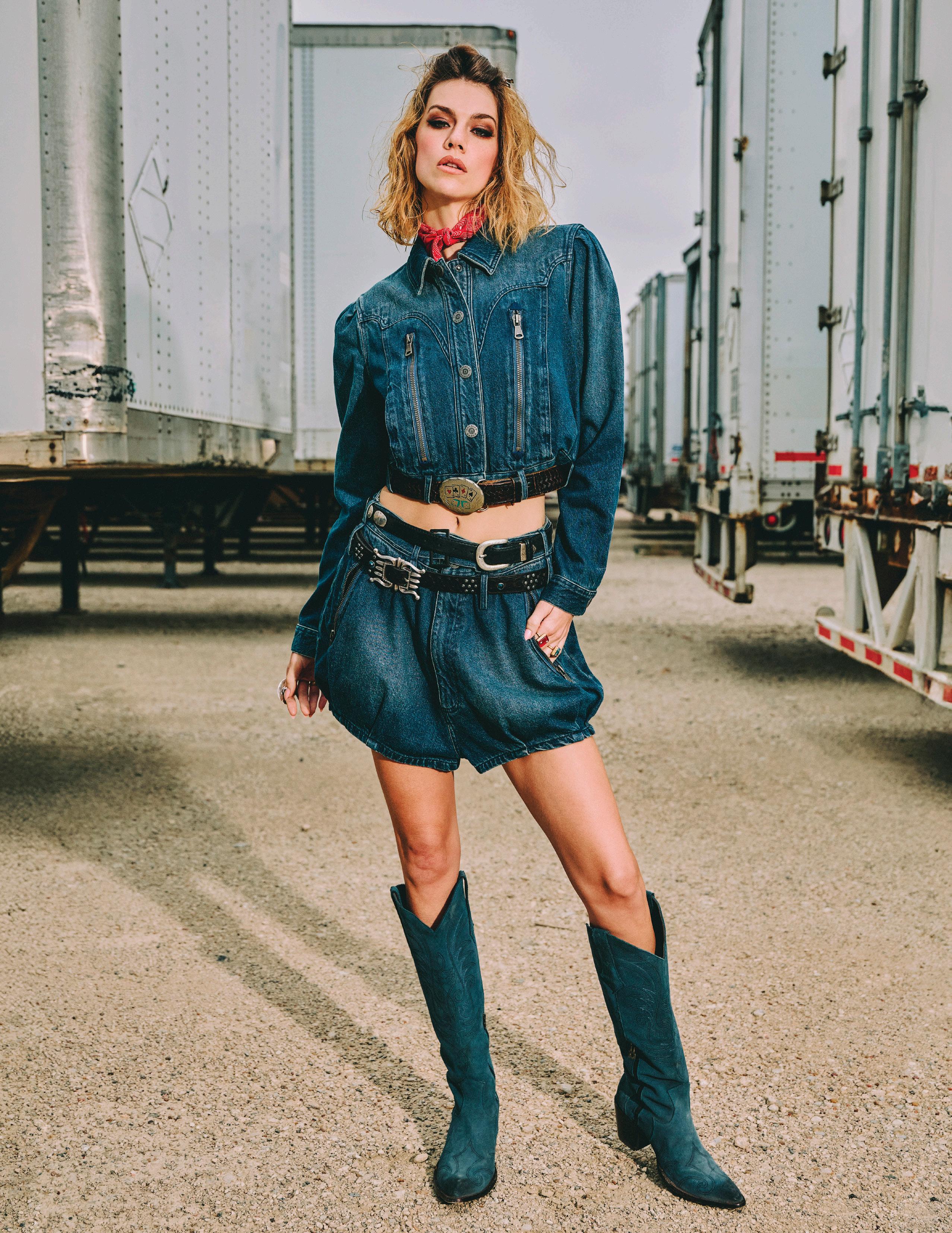 with our denims. The goal was to keep the pieces on trend, but also exploit the edginess of the collection, adding things like extra-long zippers and unexpected shapes. The jacket gets a tailored-volume vibe from puffed sleeves and a unique belt-able waist. The shorts boast a bubble look with a widened hip and a pinch-pleat at the hem – and of course, we added a second set of belt loops because we are still very much loving that layered belt look!