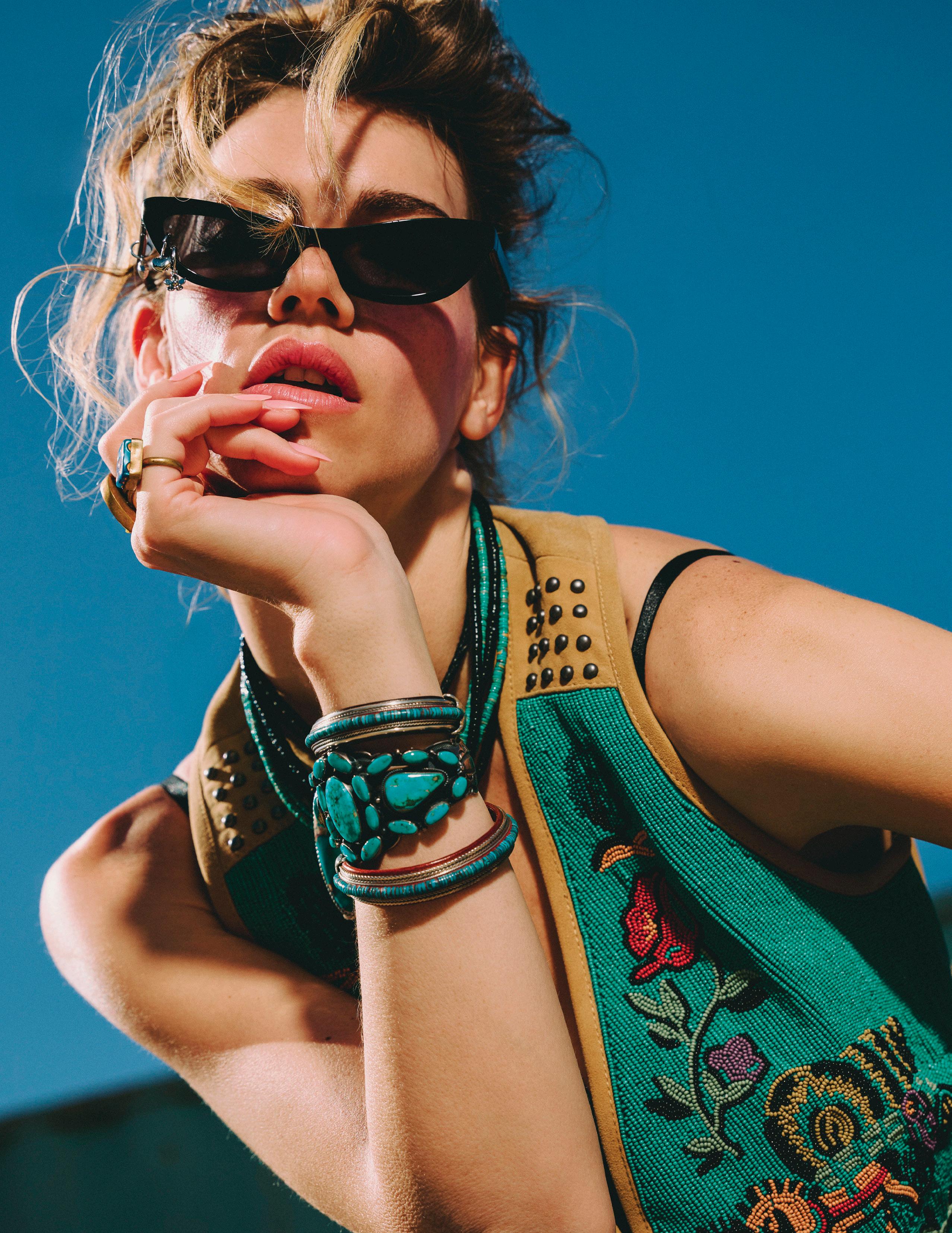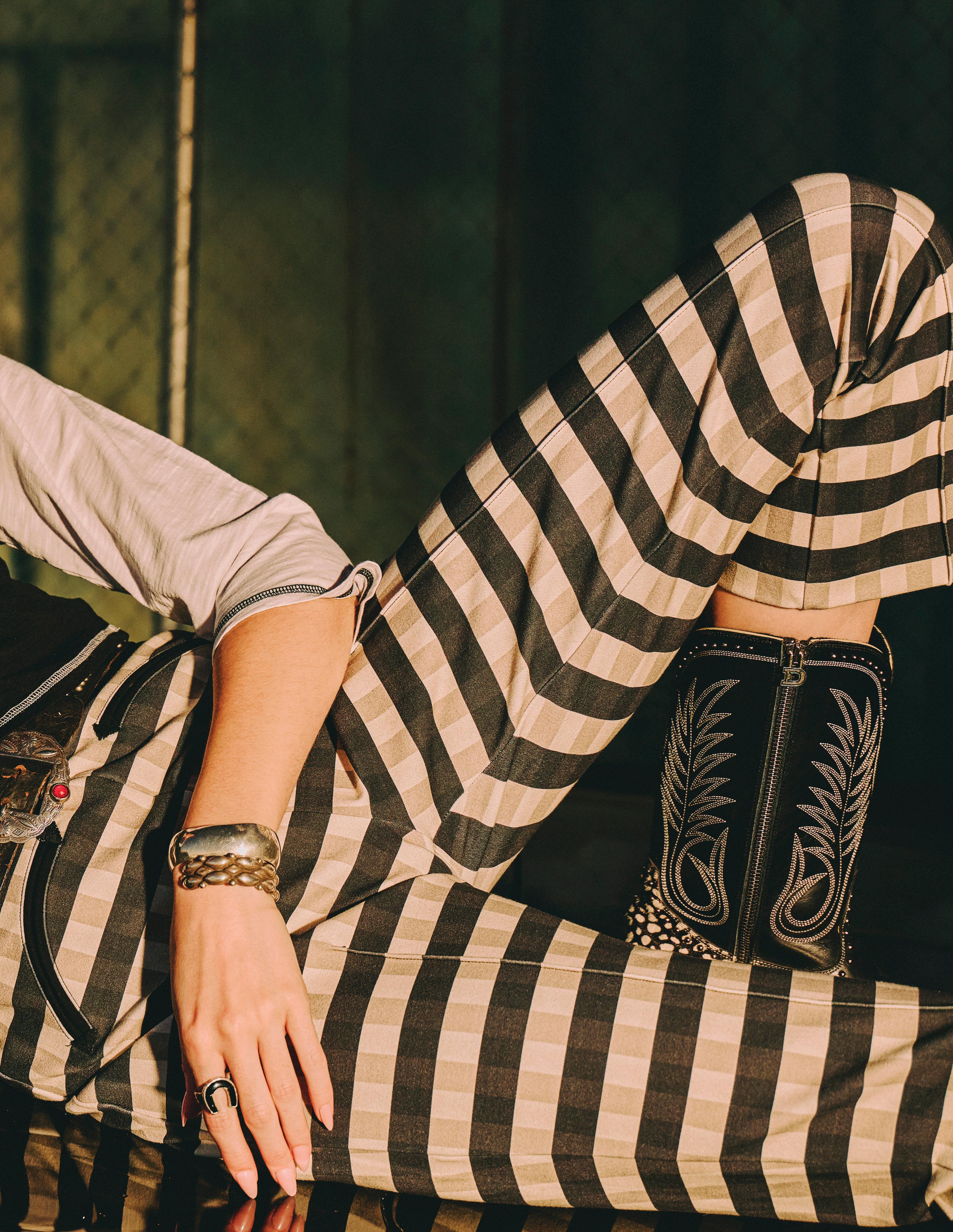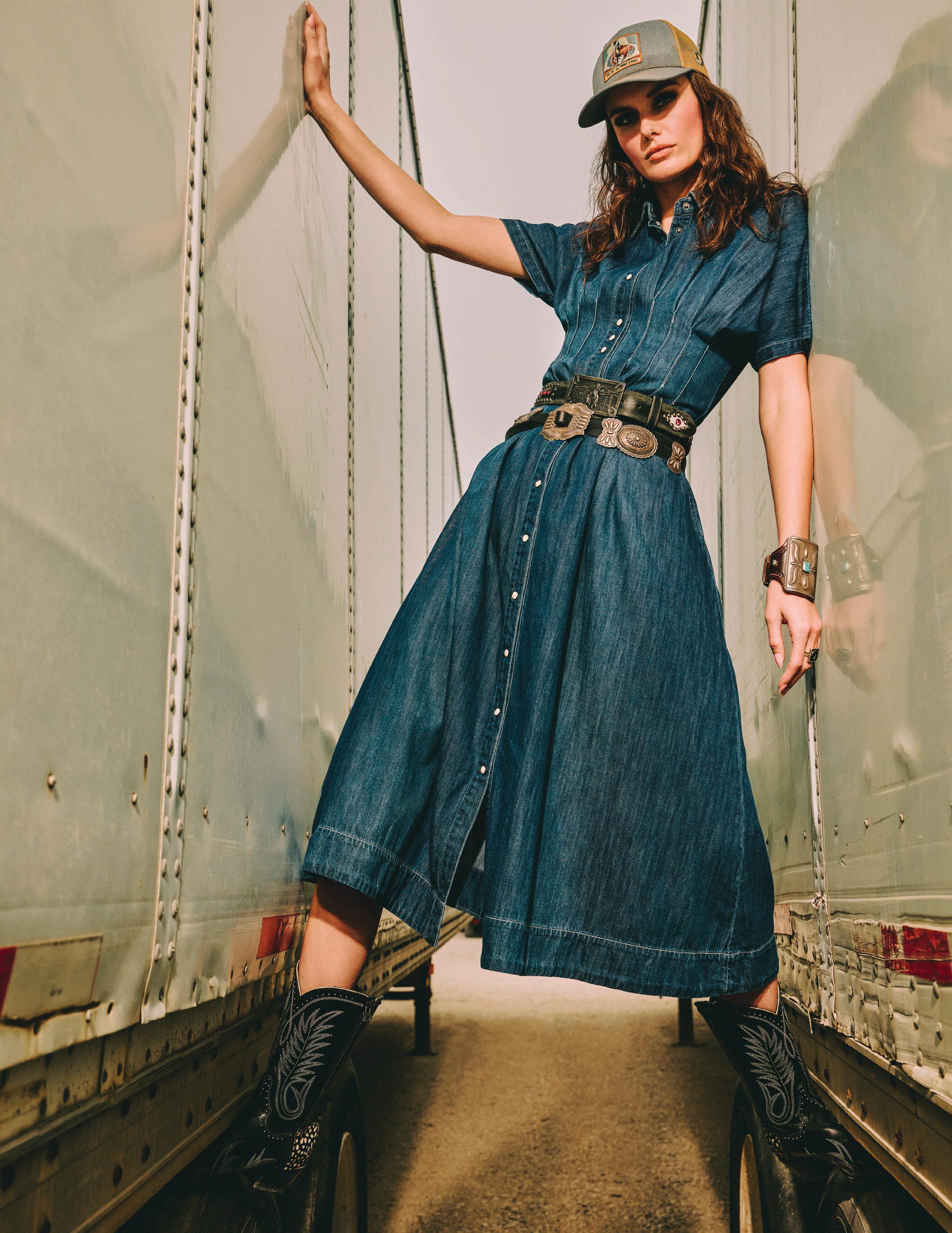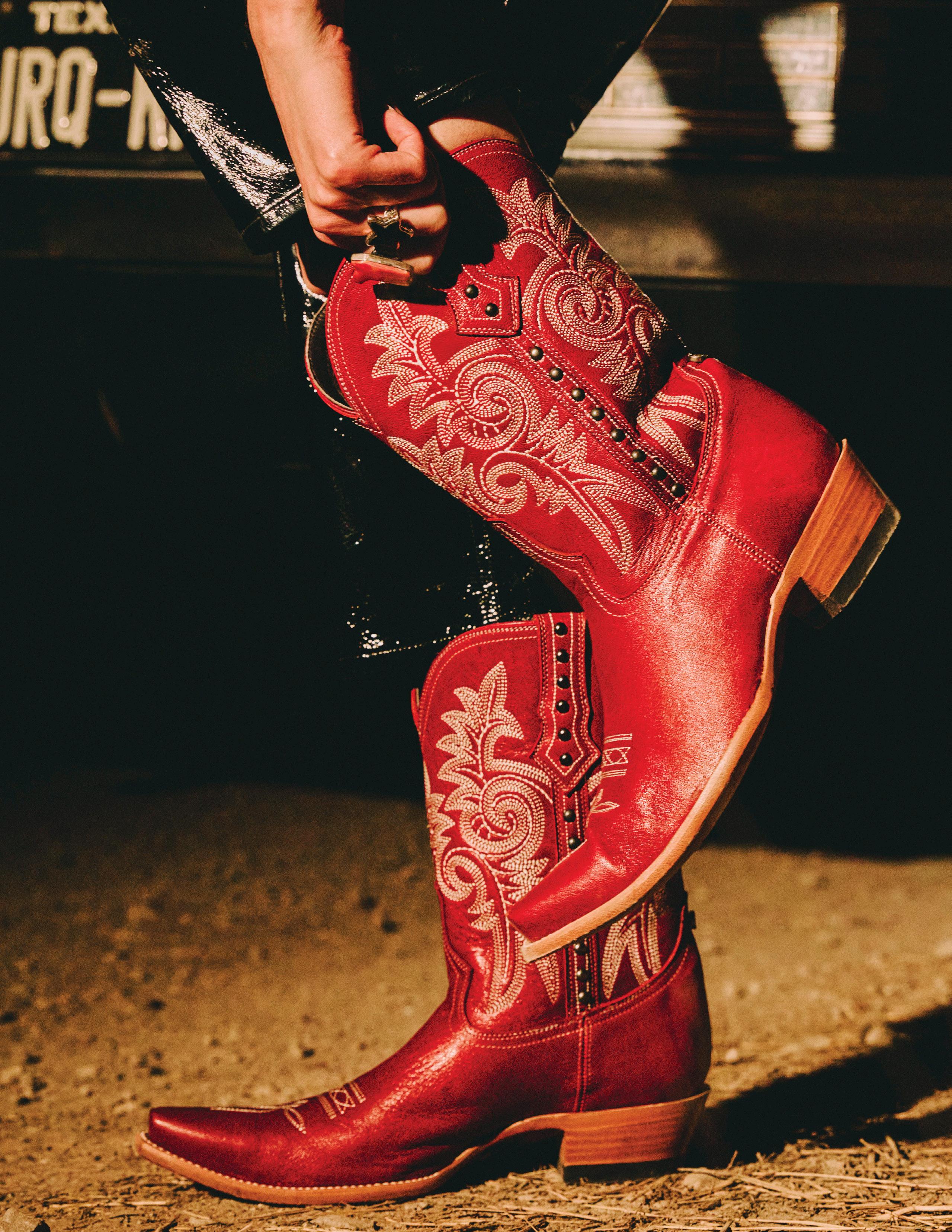 Part of it is edgy, a little punk rock. Studding that’s placed intentionally to feel more like piercings, Western welts that are more pointed than smiley, fabrics that contrast shiny and sheer, and more belt loops than you ever knew you needed. Plus, a badass pair of new boots that replaced your standard pull tabs with a gemstone-studded biker belt strap.