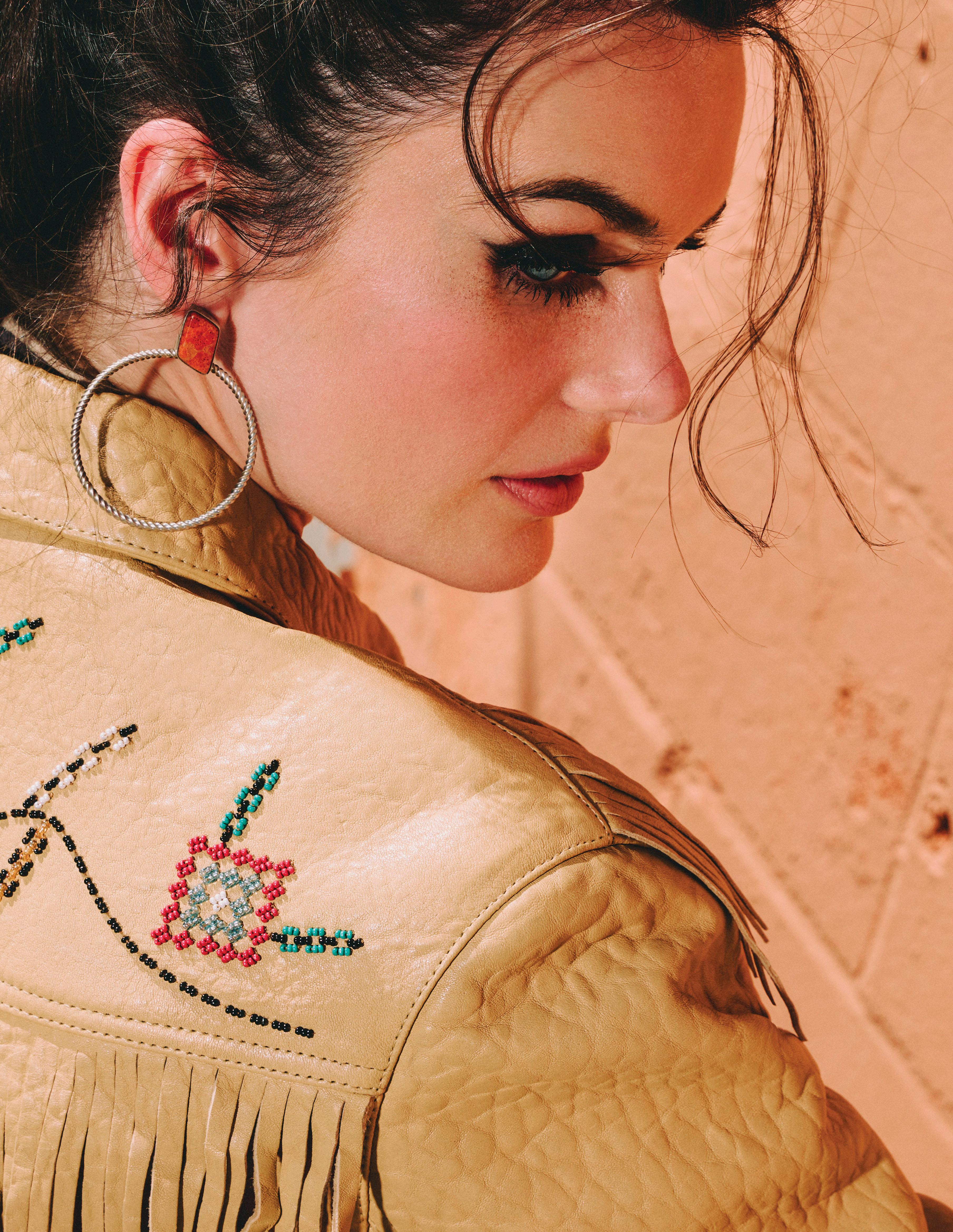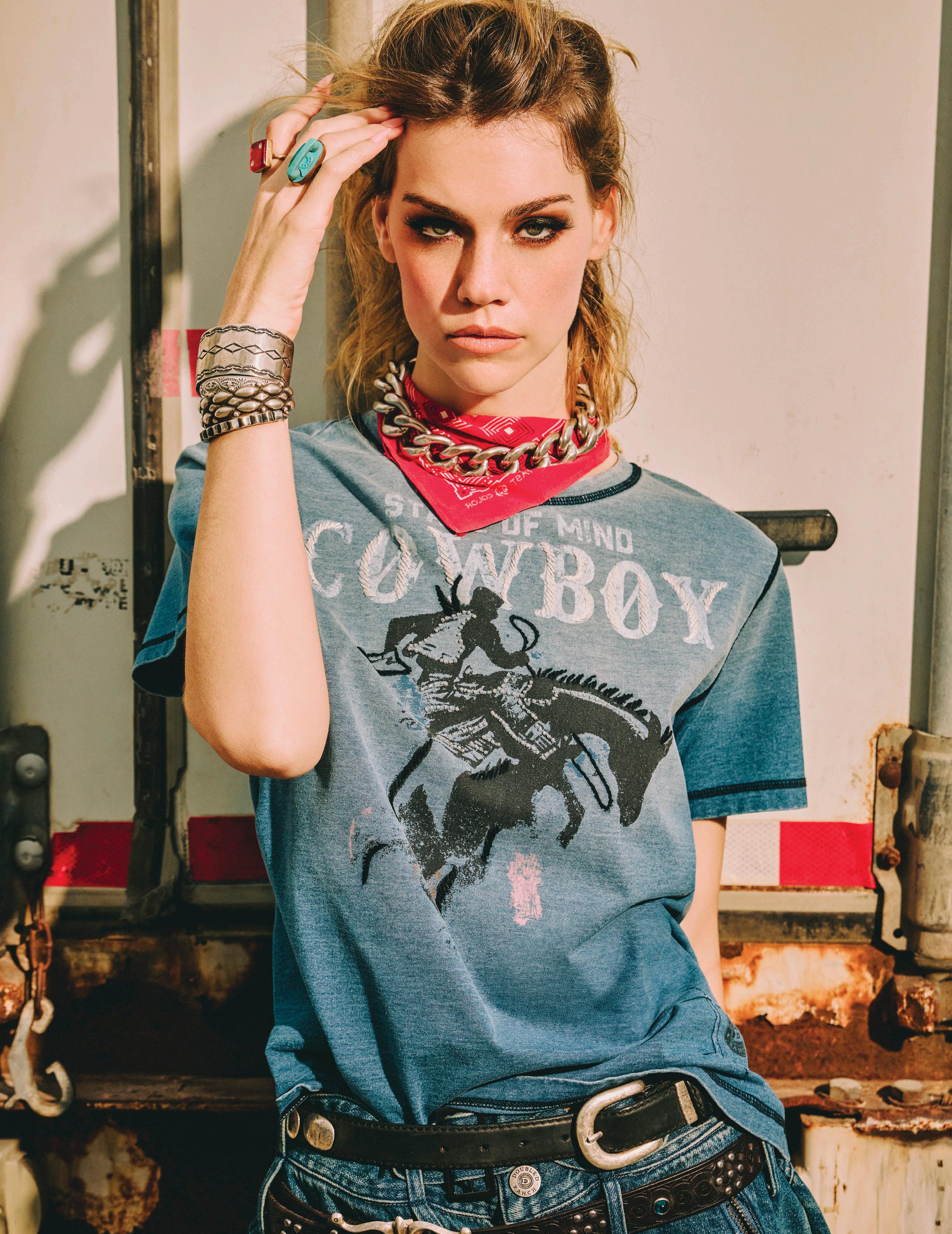 Part of it is traditional, tried-and-true detail you can always expect from Double D Ranch: exquisite hand-beading, custom concho buttons, cool graphic tees with embroidered accents, and leather lacing and fringe finishing touches.