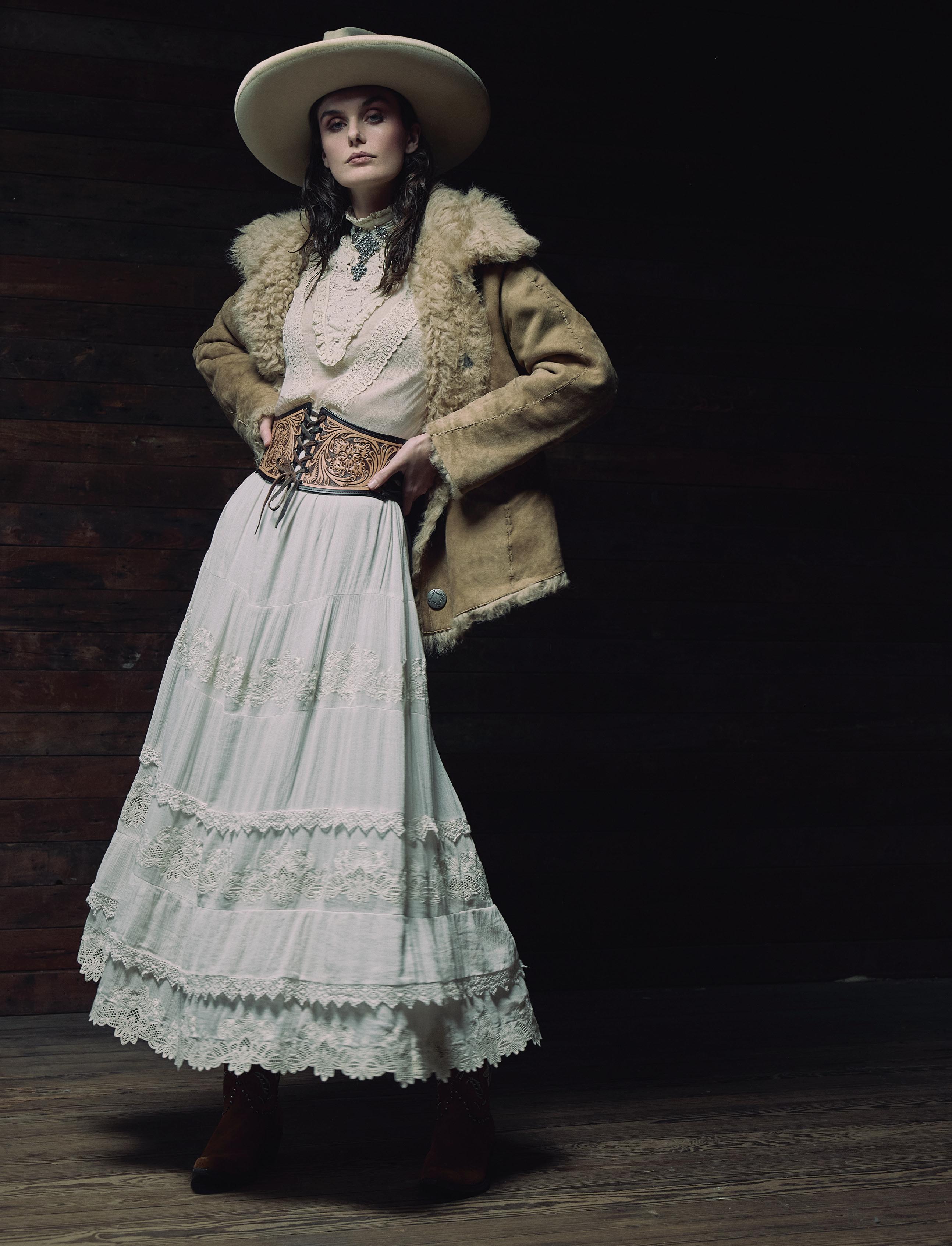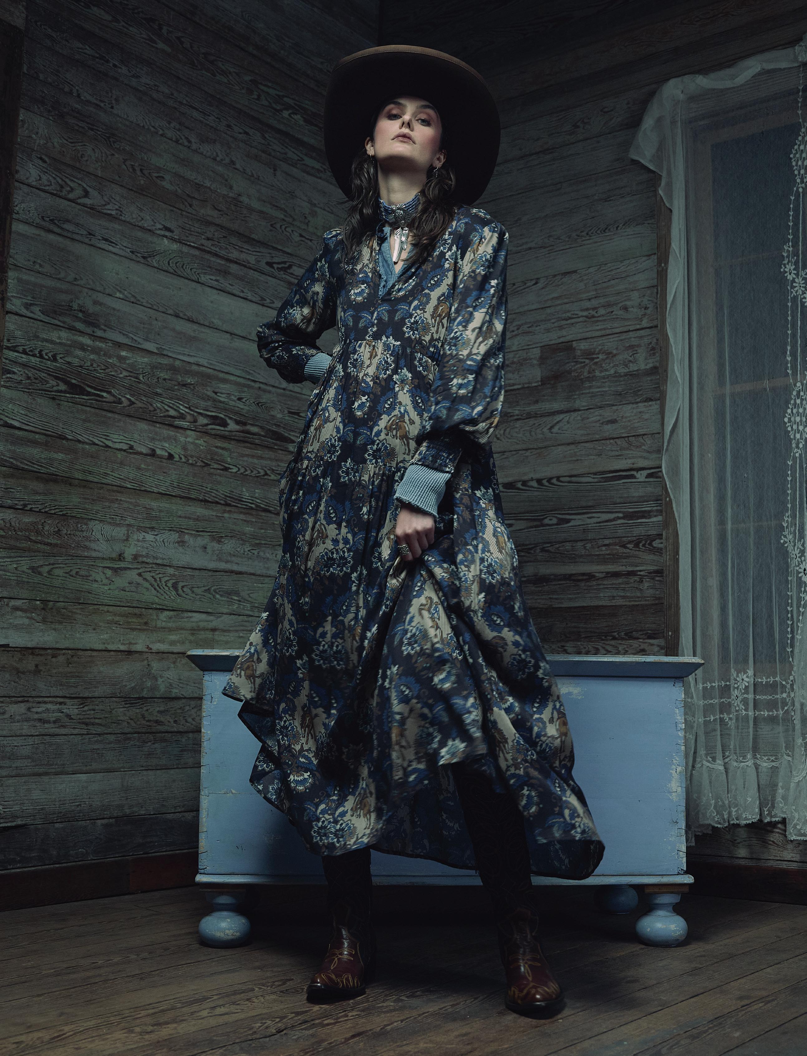 The Wash House collection balances softened blues and almost-black browns, with an undercurrent that implies weathered and well-loved. We incorporated aesthetic influences of old-timey cotton sacks, era-inspired Western garb, and one-of-a-kind vintage creations, from quilt coats to caps. We elevated traditional undergarments into elegant outerwear, bringing bloomers to life in velvet and putting the petticoat center stage.