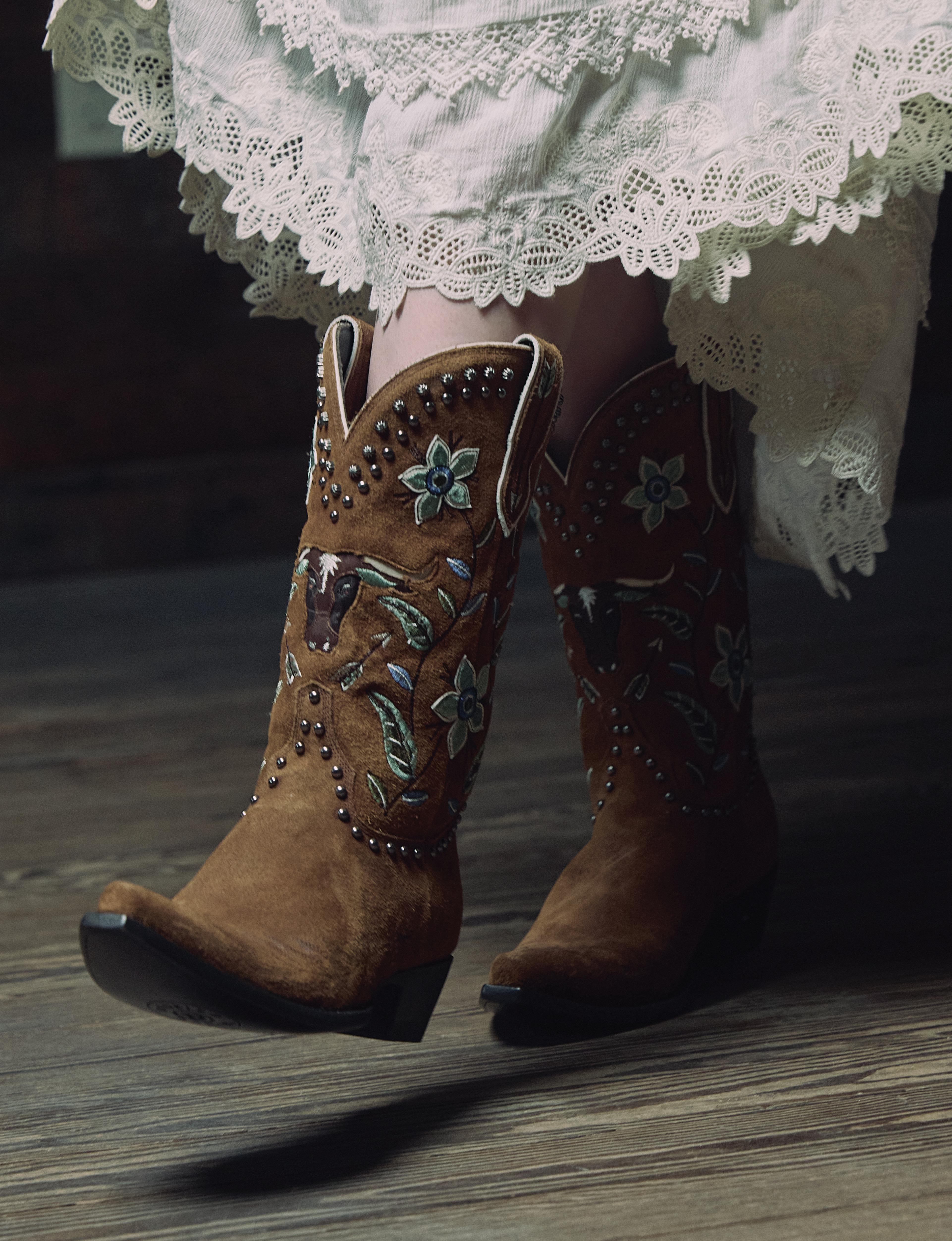 Fancy footwear is among the top tier of things we pride ourselves on, right up there with statement bikers. We commit ourselves to every detail, from shaft length to heel height and even how we embellish the pull tabs. This season’s statement boot is crafted in that beautiful dark bronco brown (it’s a subtle nod to the way black faded back then) and embellished with intricate florals meant to mimic the dainty details we’d find on the garments in the trunk.