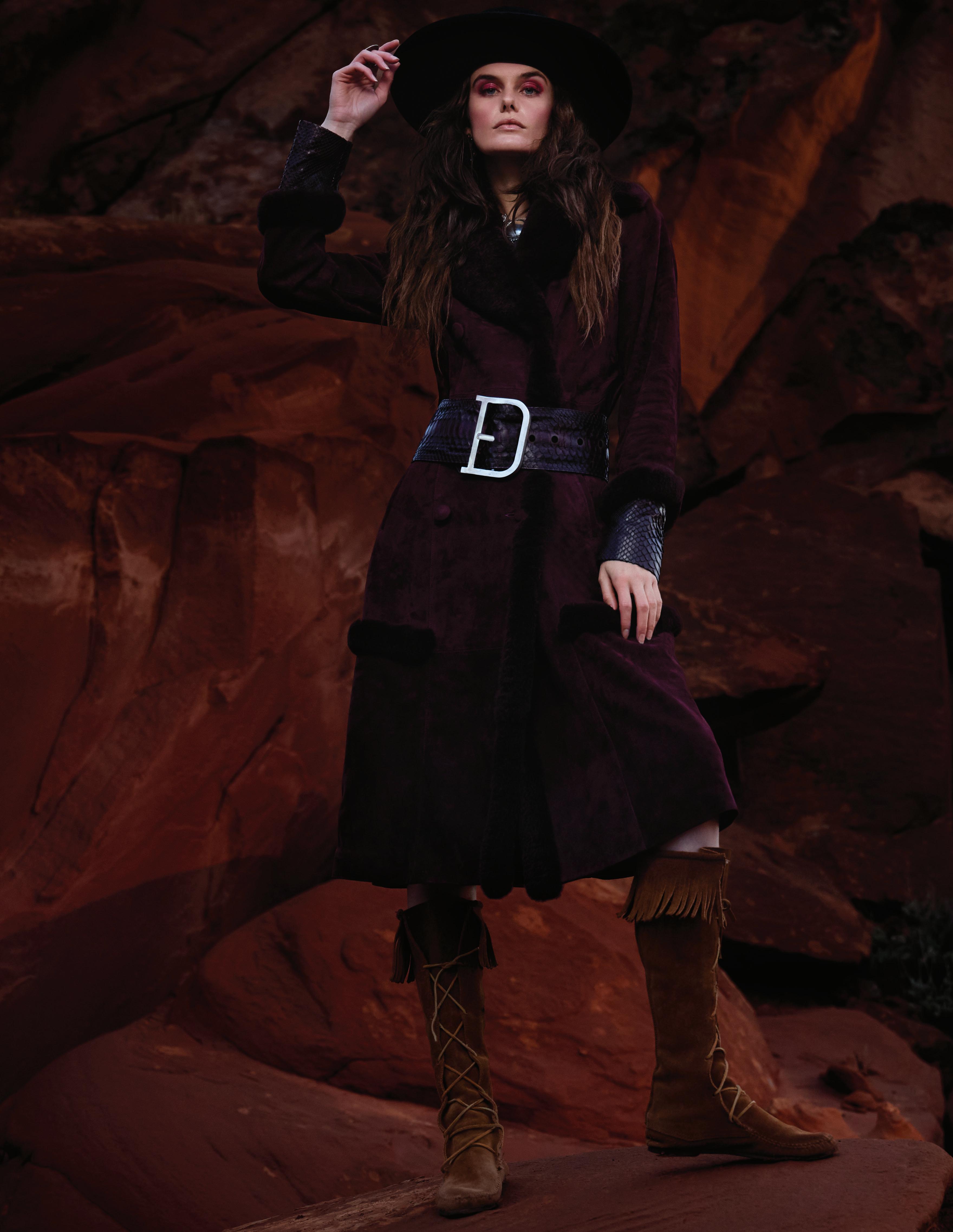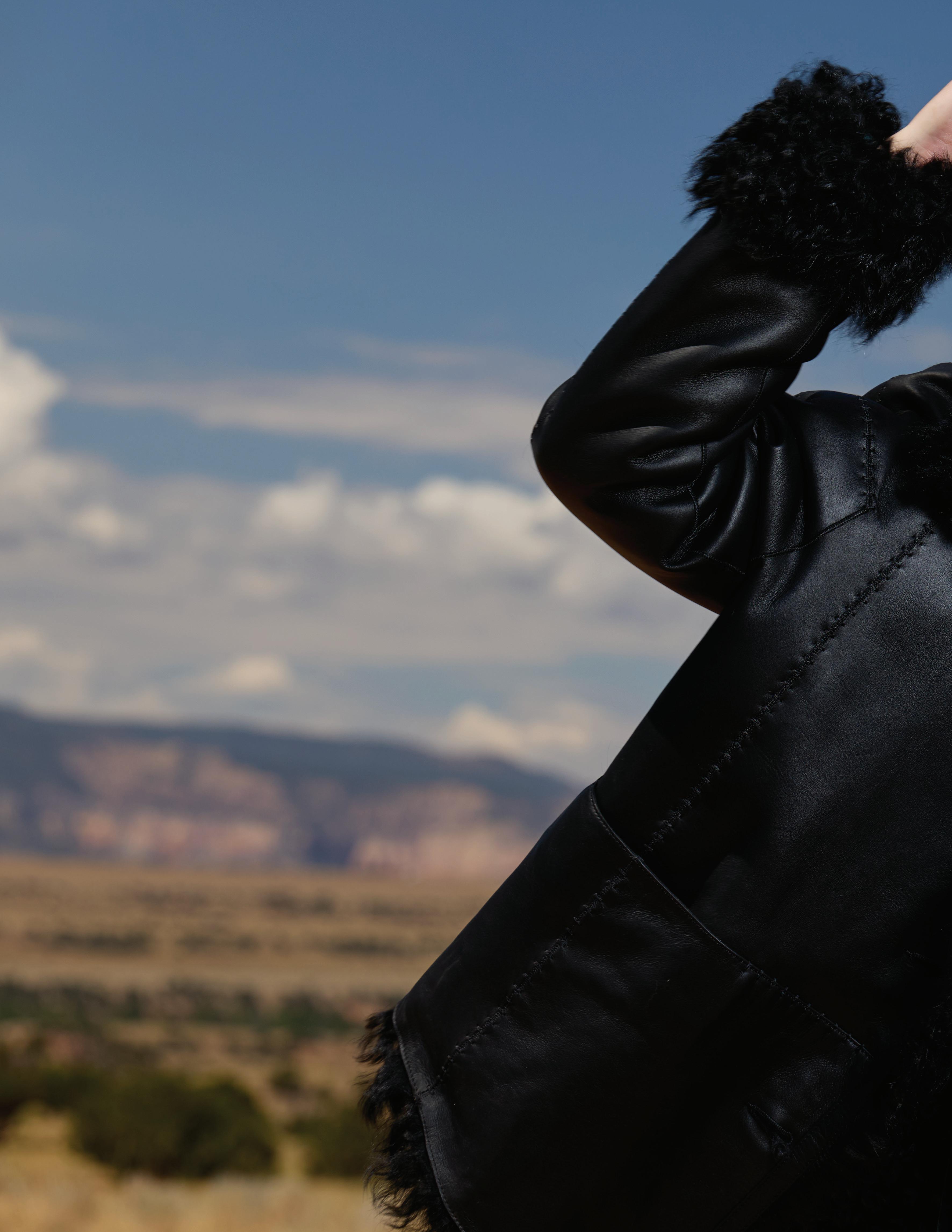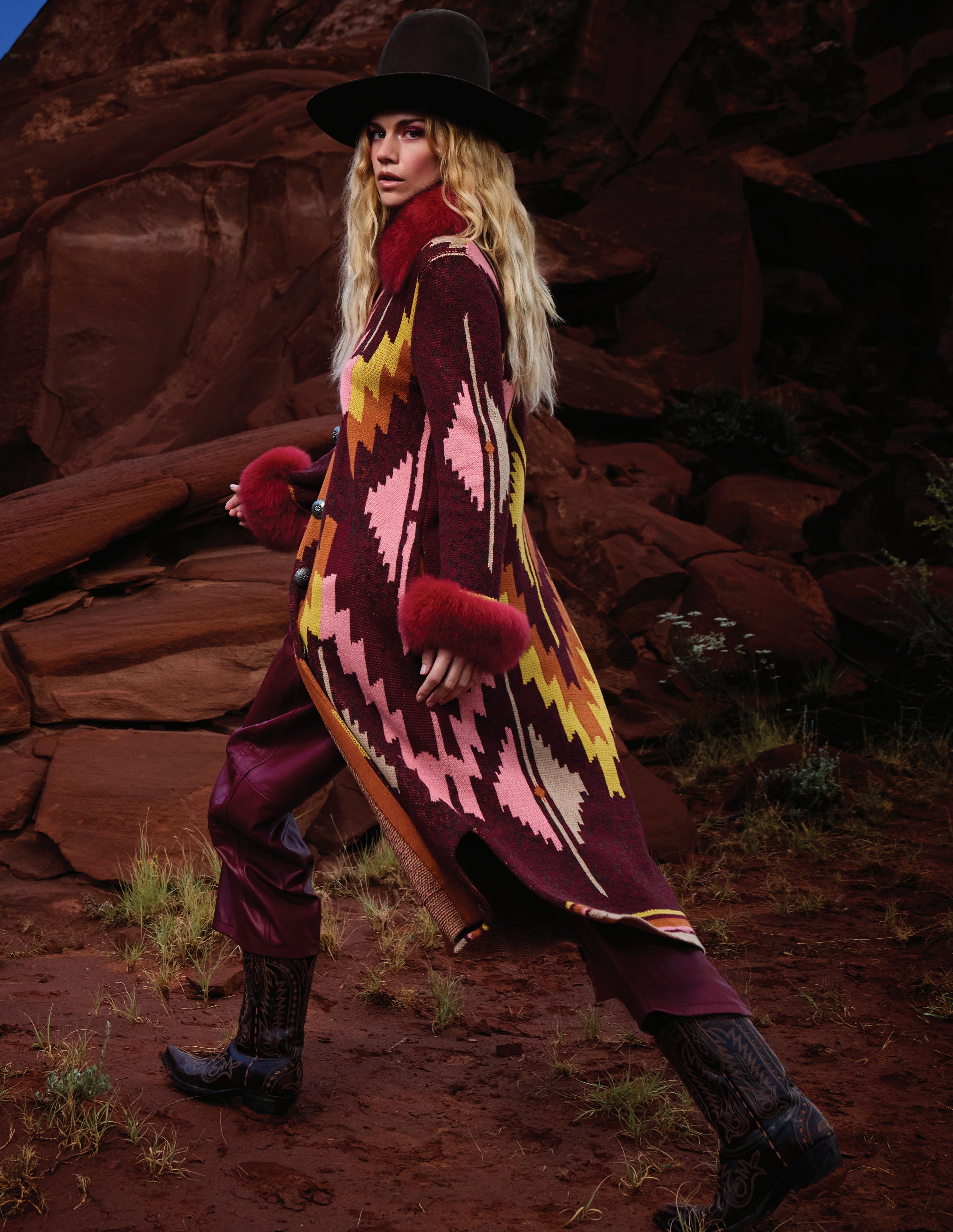 The colors are strong and saturated, from rich wines to rodeo browns and the most extraordinary pop of poison coming to life in patent leather. We’re showcasing Maura Allen’s awe-inspiring artwork in stunning silks and suedes and signature prints. The silhouettes are unapologetic, whether it’s a sweeping caftan or a statement suit, a fringed pant or a full-volume fur. The whole collection is pulsing with an undercurrent of having a powerful presence.