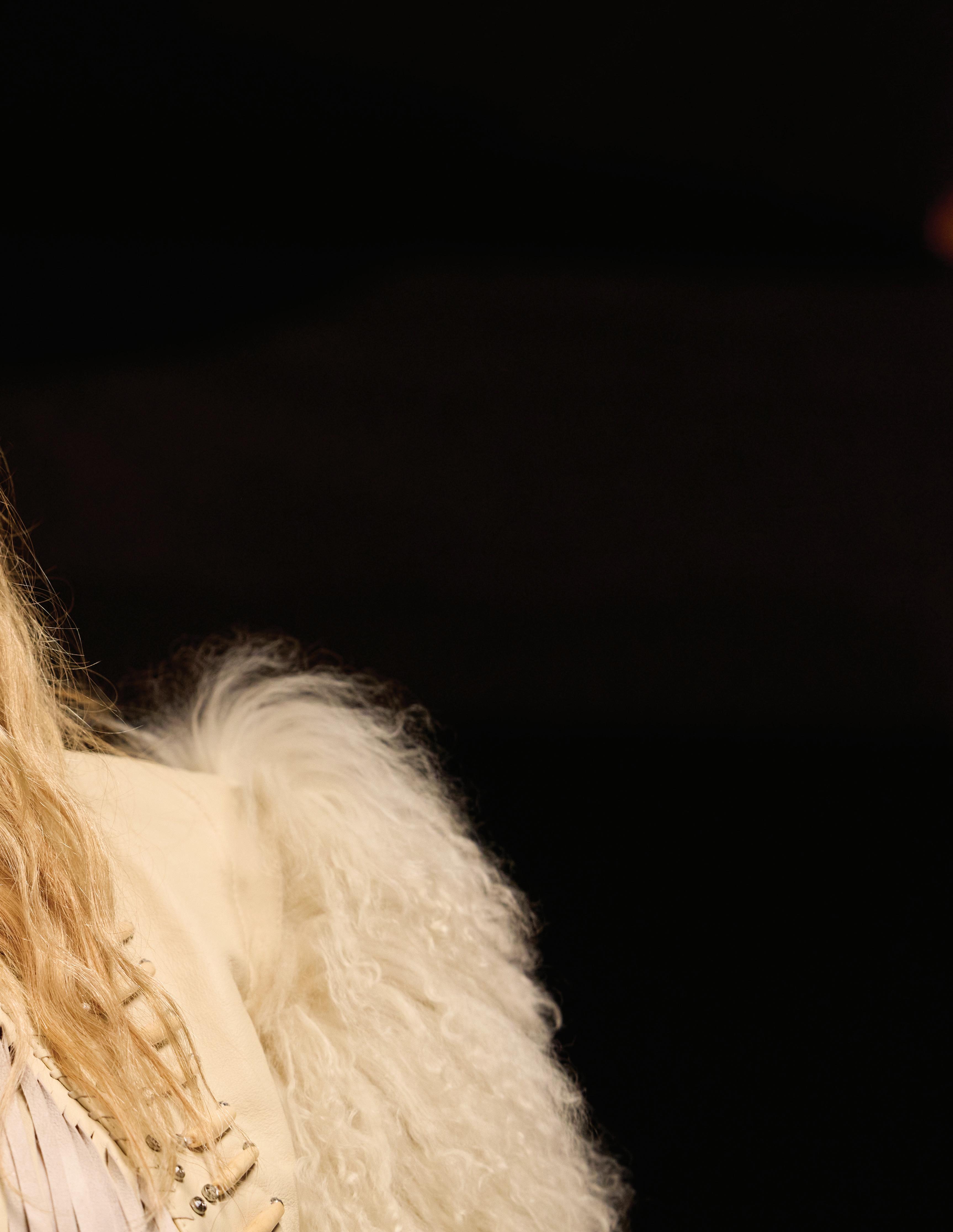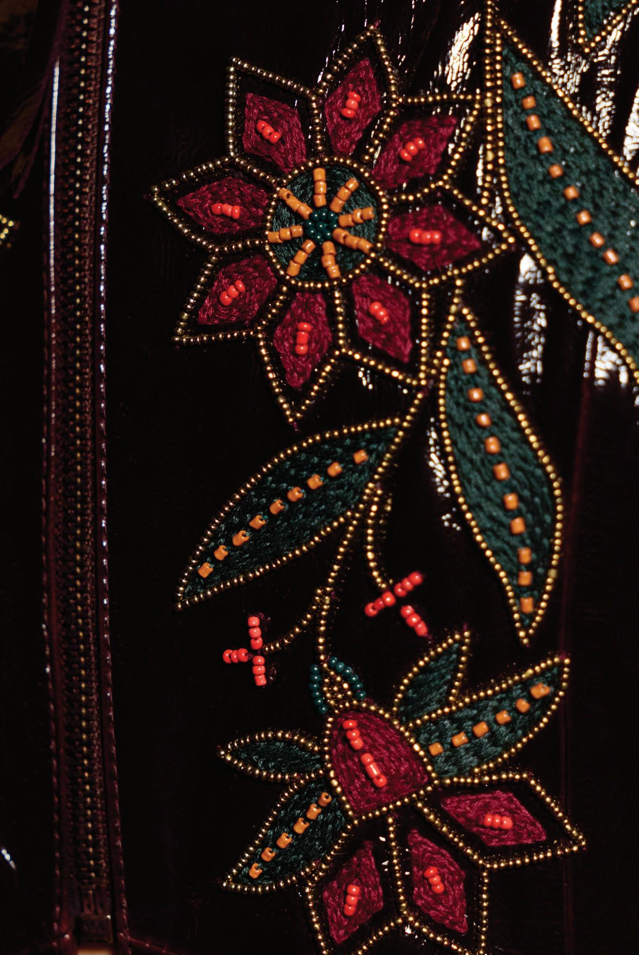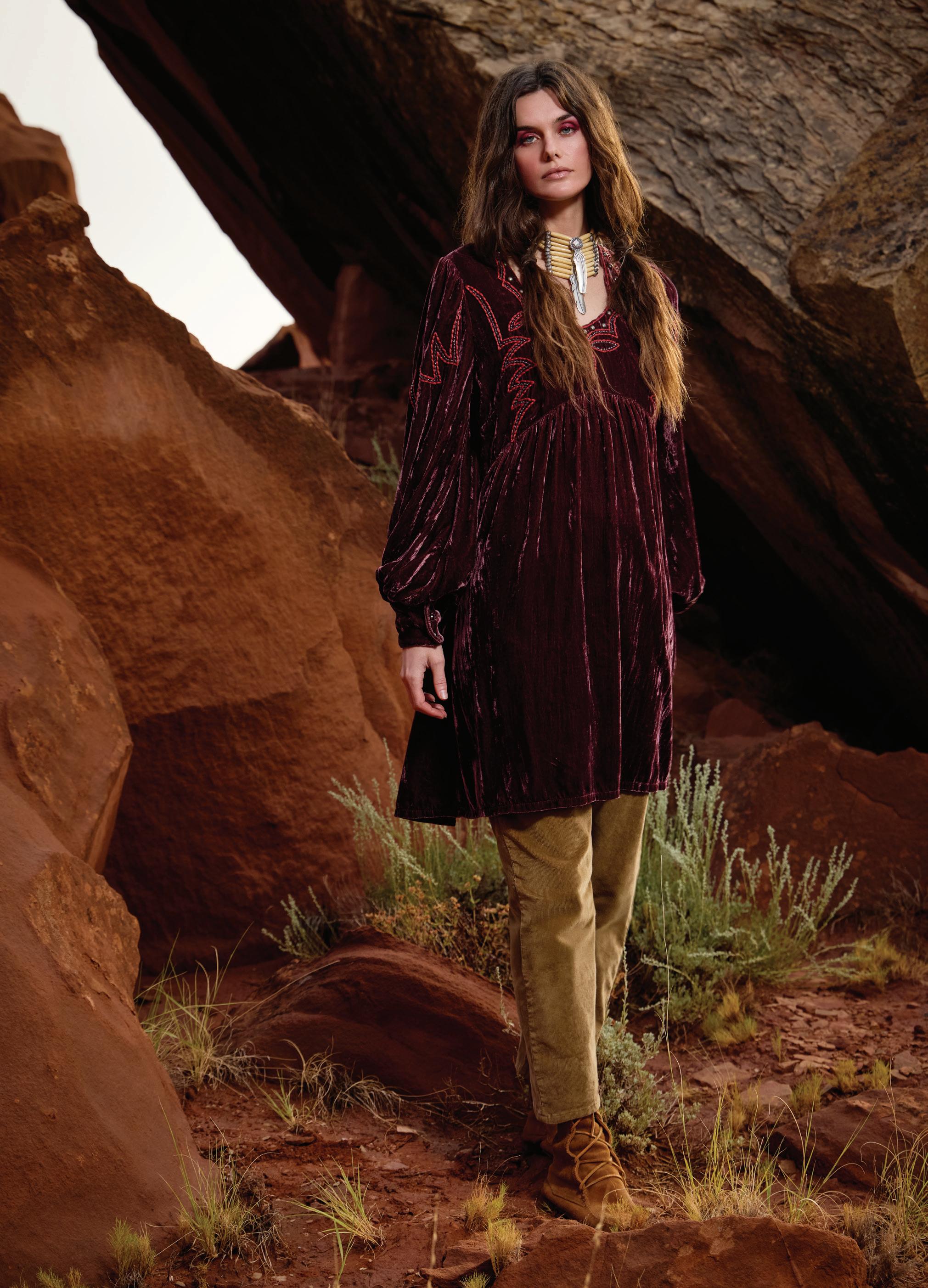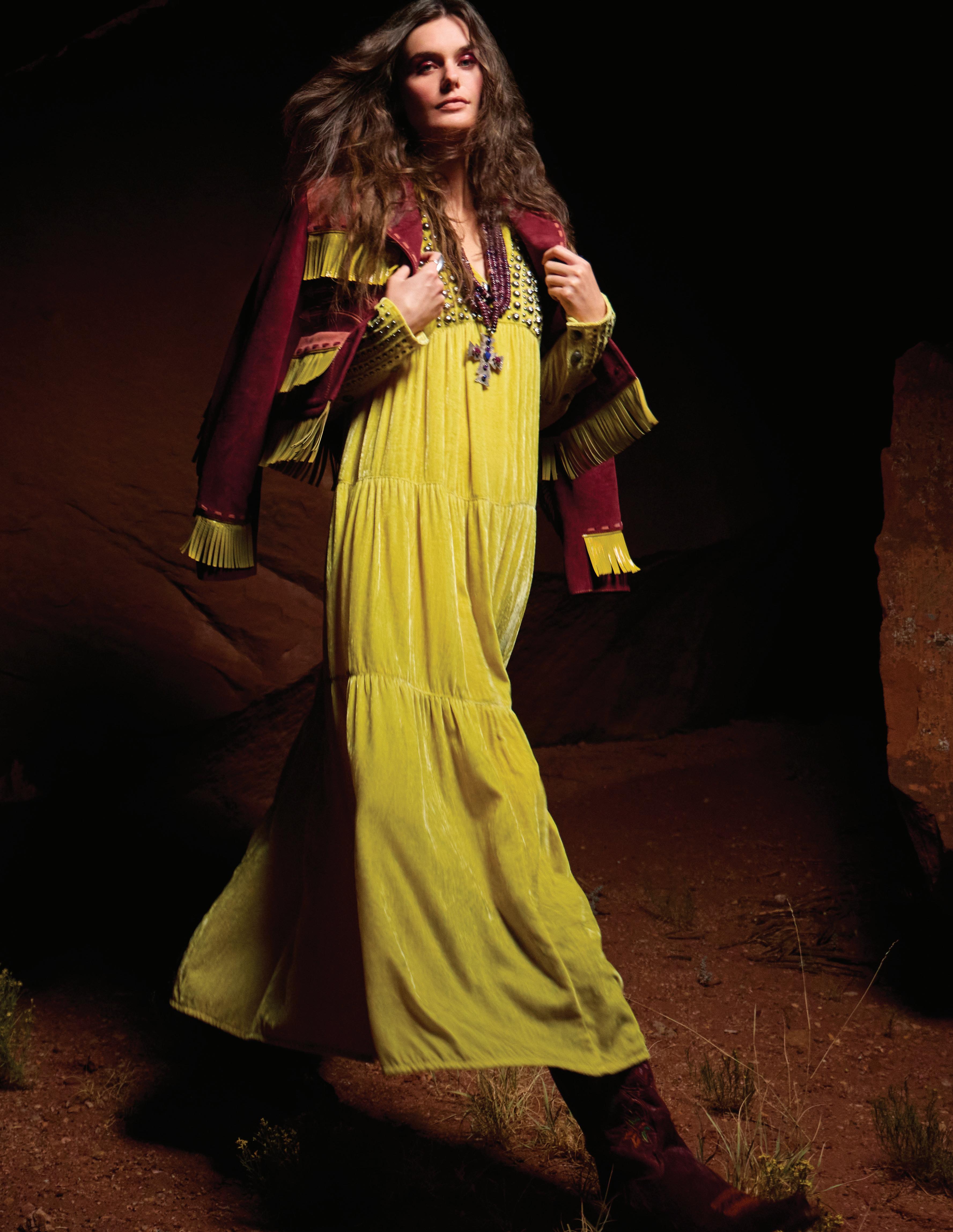 The colors are strong and saturated, from rich wines to rodeo browns and the most extraordinary pop of poison coming to life in patent leather. We’re showcasing Maura Allen’s awe-inspiring artwork in stunning silks and suedes and signature prints. The silhouettes are unapologetic, whether it’s a sweeping caftan or a statement suit, a fringed pant or a full-volume fur. The whole collection is pulsing with an undercurrent of having a powerful presence.