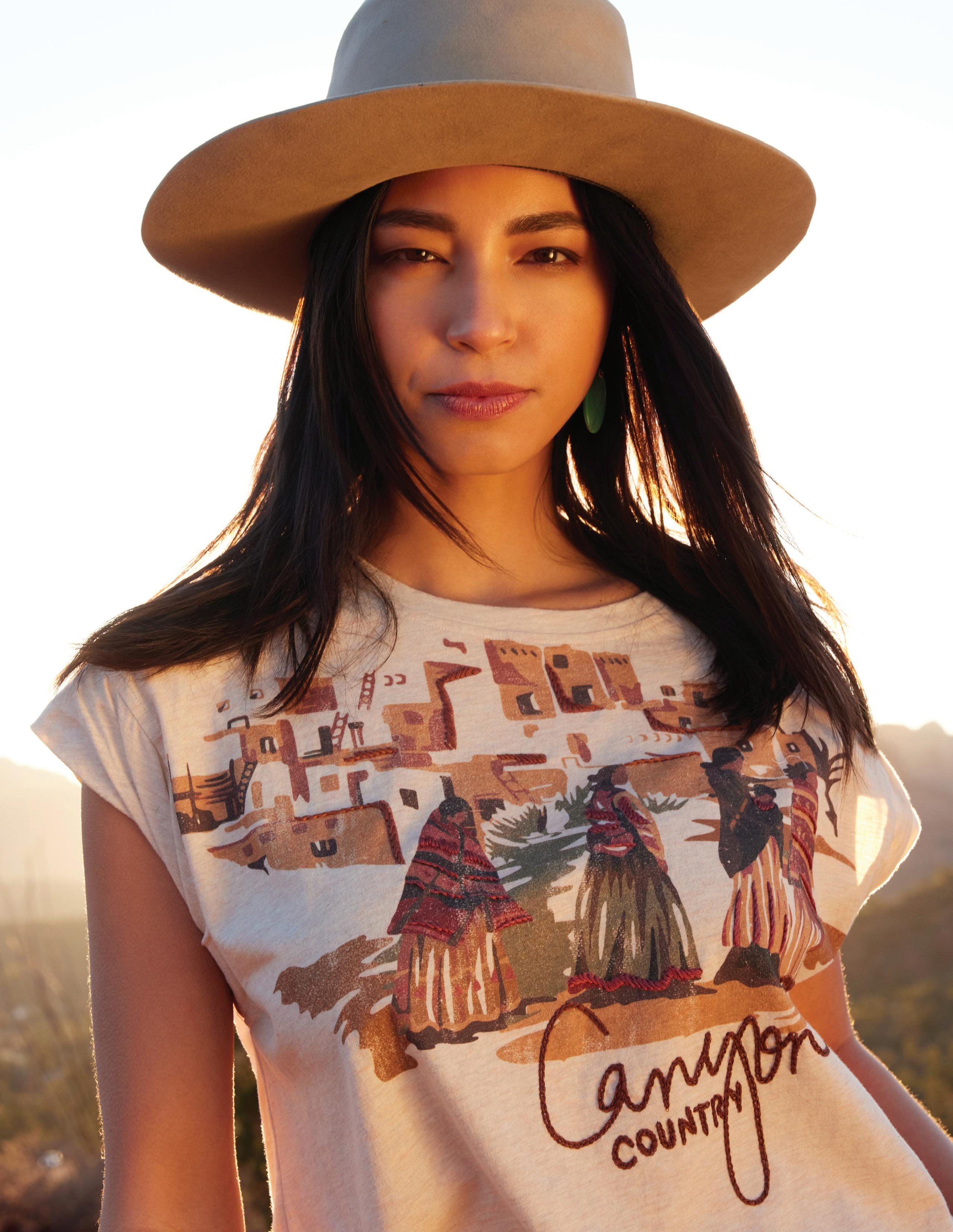 One of the very first illustrative custom prints we ever designed, back in DDR’s infancy, this classic canyon scene captures all the elements that surround you: the landscape and the life; the flora, the fauna, and the folks. It’s imagery that still speaks to us, our sartorial style, our identity as a brand, and everything we appreciate about the southwest. We revived it and recolored it, and we’re in awe of how something from decades ago translates so seamlessly to today. It’s a testament that true style really is timeless.