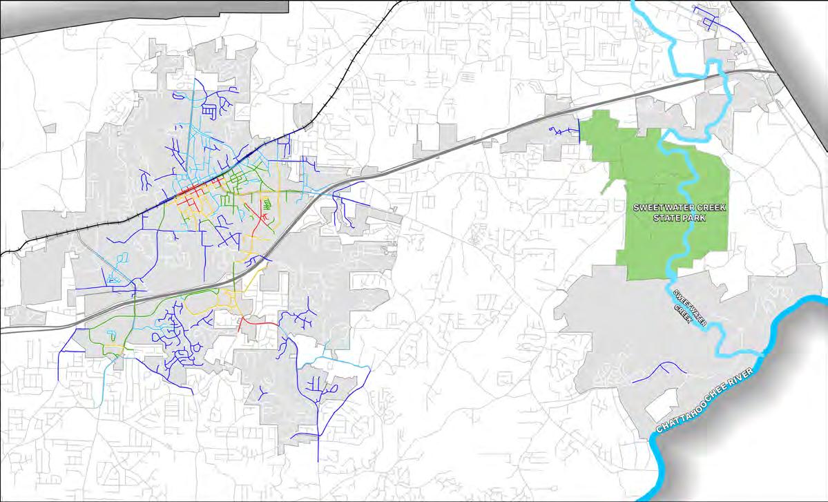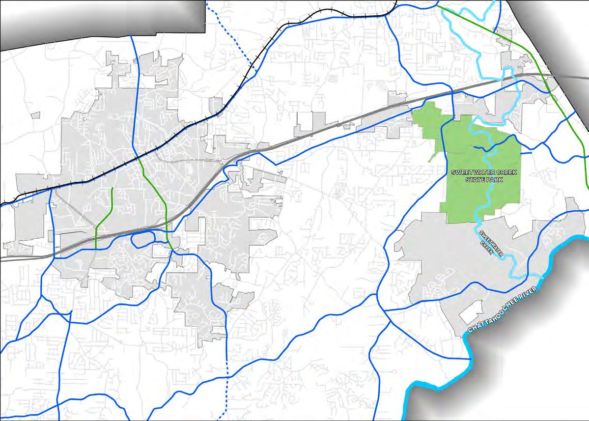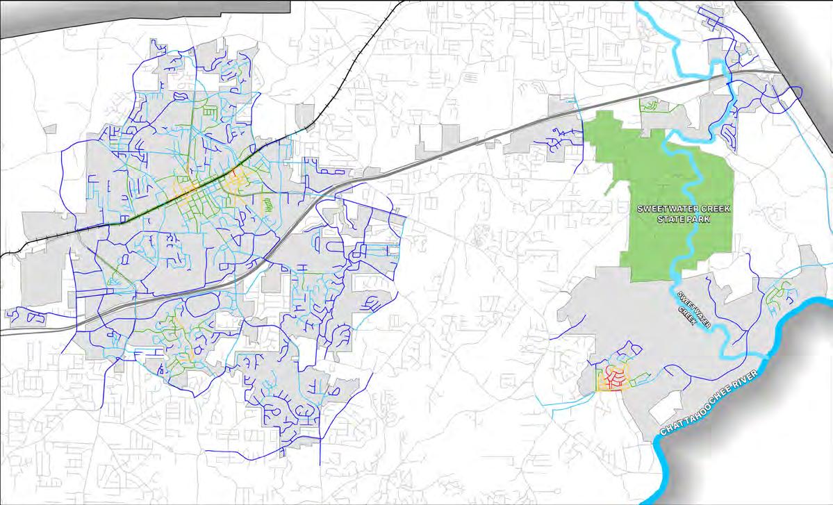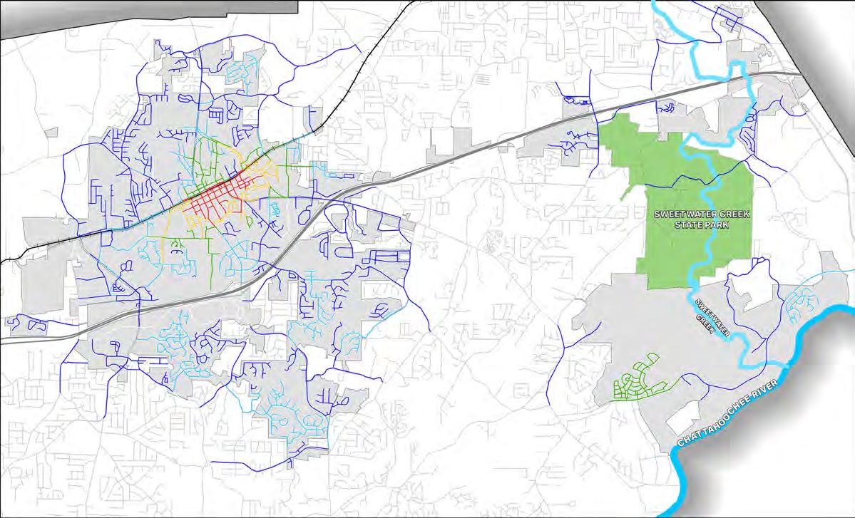 The City of Douglasville is on the cusp of a transformation. The State Route 92 Bypass is nearing completion. When it opens, traffic that once caused noise and congestion at the at-grade railroad crossing in the heart of downtown will be routed around Douglasville to the northeast. Overnight, downtown will be transformed back into the quiet town center that it used to be. This is an incredible opportunity. It is the perfect time for Douglasville to pivot into a place that promotes active transportation to boost its economy and the health and happiness of its citizens. In order to act upon this once-in-a-lifetime opportunity, the City of Douglasville retained AECOM to study the connectivity of the existing pedestrian and bicycling network to provide a path forward. The result of that effort is a list of 122 projects prioritized based on their value as first steps. These recommendations can be found in the final chapter starting on page 188.