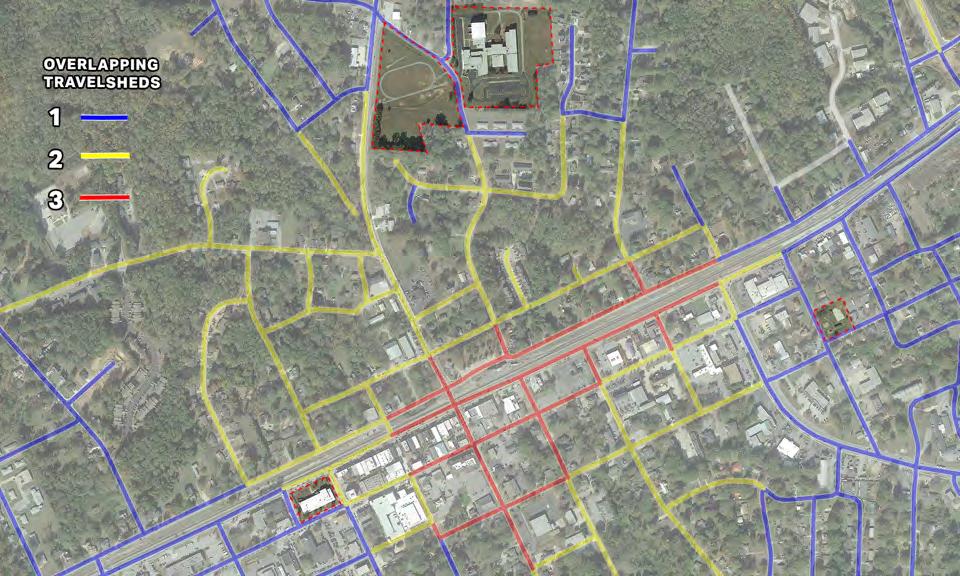 In the Network Analysis chapter of this document, we assessed the existing connectivity of Douglasville’s transportation system through the lens of a pedestrian and a cyclist. In order to understand whether the recommendations described to this point will have an impact on connectivity, we performed the same analysis on the network if all of the recommendations were implemented. This provides us a before and after picture of connectivity. Once again, we take the difference between the existing connectivity and the final condition connectivity to get a sense of the impact of our recommendations.