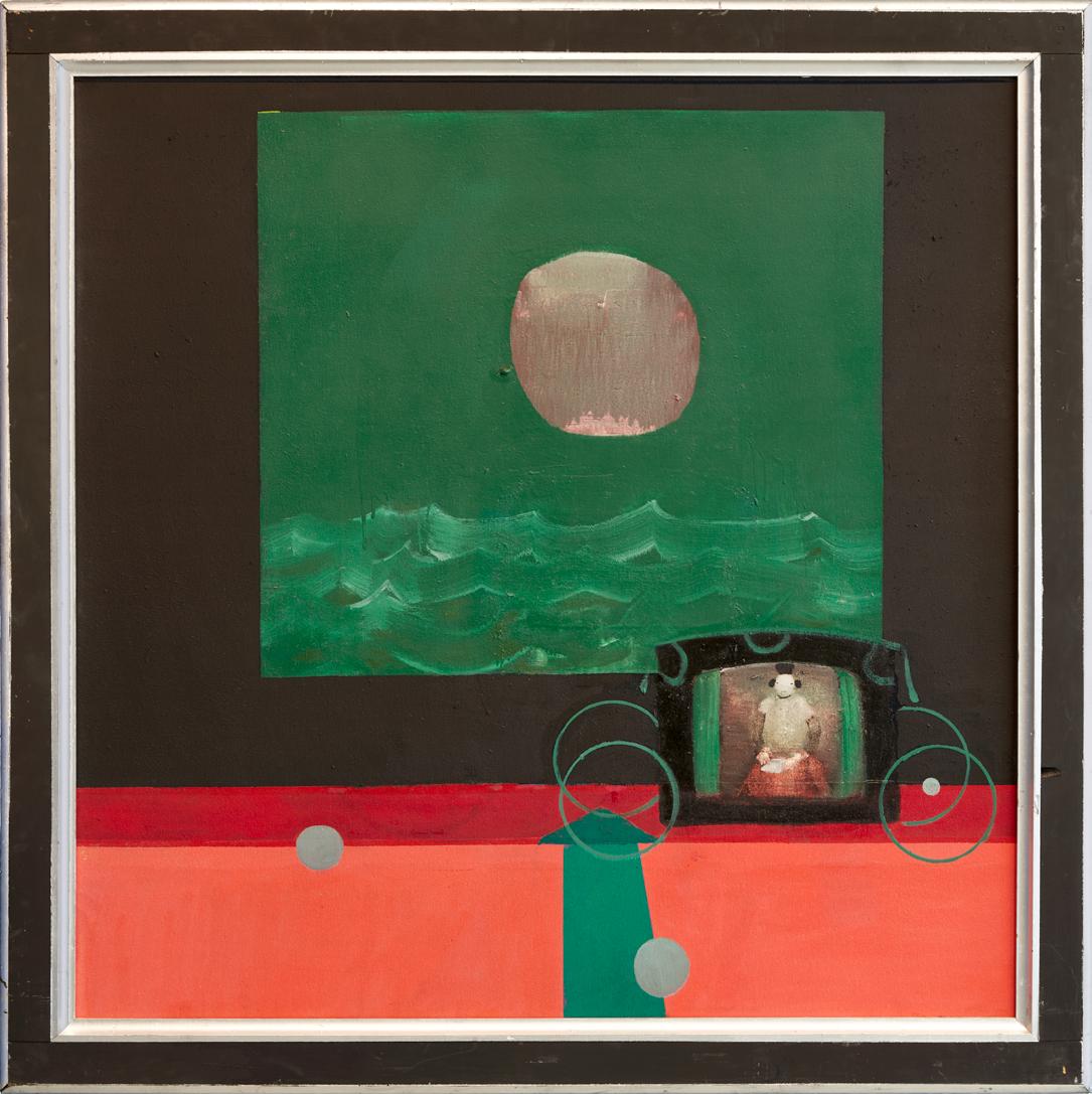 In his characteristic make-do fashion, Hamilton mostly used house paint from the local hardware store, stretching his own canvases or more often working on Masonite panels. He fabricated and painted his own bespoke frames, adding a Baroque, old-world flair to his dreamlike compositions. In the late 1970s, he largely withdrew from the art world, choosing to exhibit his work primarily at The Octagon, an eight-sided gallery he built on his property in Port Clyde, Maine, where he and his family had spent summers since the 1950s, and where he lived full-time after retiring from RISD in 1981.