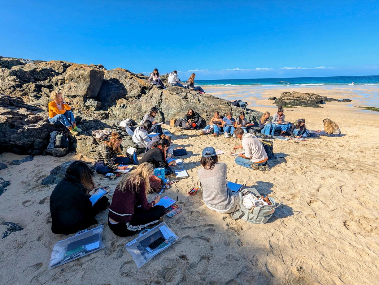 During the first short exeat, Creative Art Scholars from Lower Fifth to Upper Sixth, along with Upper Sixth Fine Art students, enjoyed an inspiringweekendinStIves.Thetripcombined practical workshops with the charm of Cornwall’s coastline. The first day took the grouptoPenleeHouseMuseumandGalleryin Penzance, where they sketched a “fish wife” and learnt about the Newlyn School, even meetingavisitorwhoserelativehadmodelled for artists of the era. They then explored Hew Locke’s immersive installation, Armada, at the Newlyn Gallery and completed creative exercises inspired by it On the second day, they went to a workshop with the St Ives School of Painting with abstract landscape artist Laura Kent, sketching around the town before developing large, layered ink and collagepiecesinthestudio