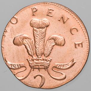 Extremely scarce, this Unc 2p should have been struck on a 25.90mm flan –actually struck on a 20.30mm 1p flan!