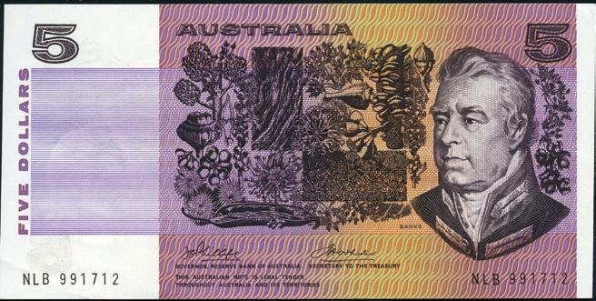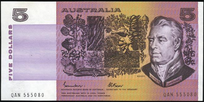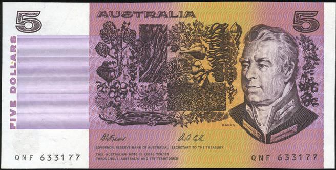 high circulation rate, a vast majority of early $5 notes have been destroyed, lost or well circulated. Many are scarce in Unc, particularly the 1967 Coombs/Randall, 1969 Phillips/ Randall and 1972 Knight/Wheeler Commonwealth.