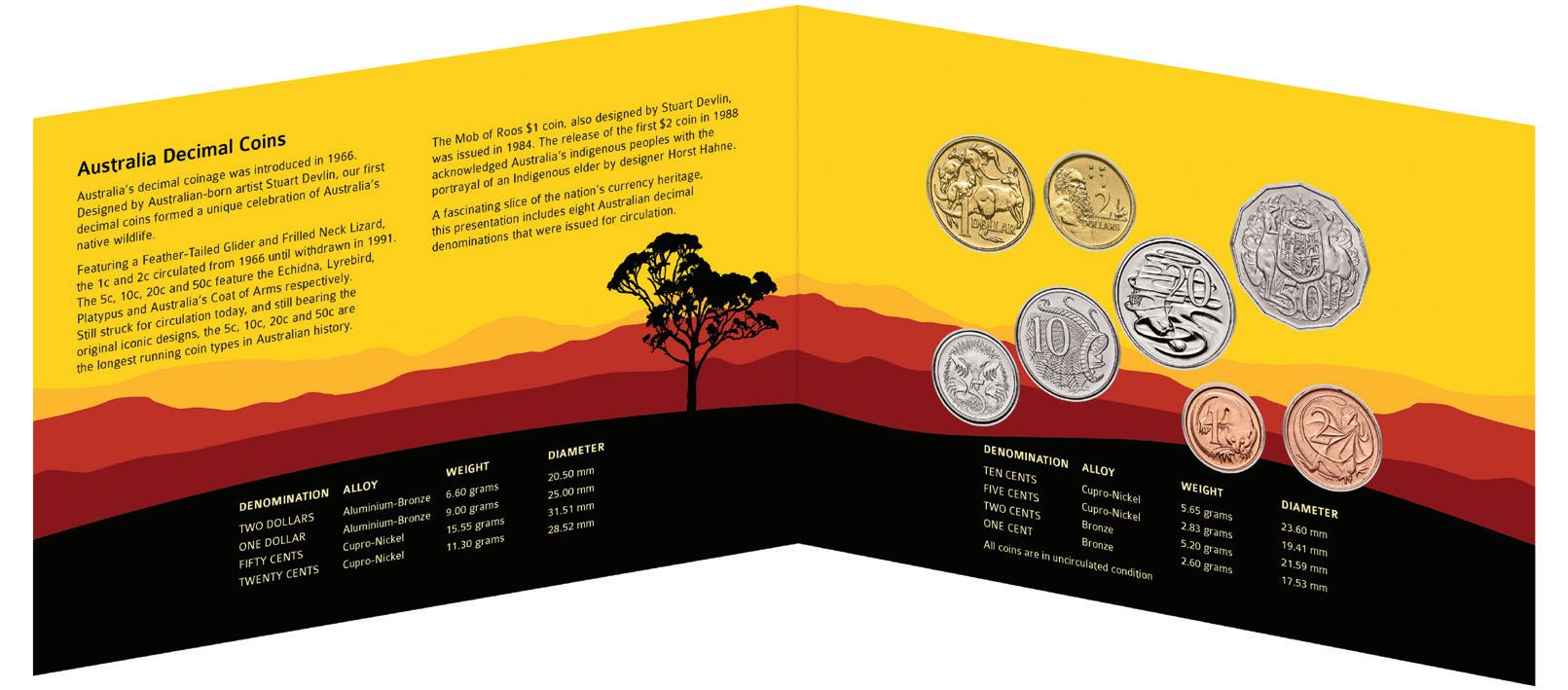 denominations issued since 1966. Including the ‘gone but not forgotten’ copper 1c & 2c, as well as the 5c, 10c, 20c, 50c, $1 & $2, the 8-coin collection is underpinned by strictly Uncirculated quality.