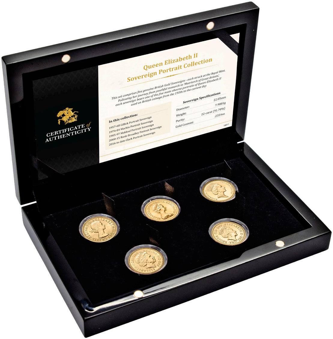 the five sovereigns feature the portraits of the Queen by Mary Gillick (1957-68), Arnold Machin (1974-82), Raphael Maklouf (1985-97), Ian Rank-Broadley (200015), Jody Clark (2016-22) respectively – dates of our choice. Featuring Pistrucci’s St George & the Dragon motif, the five coins are united within a case with a numbered Certificate of Authenticity.