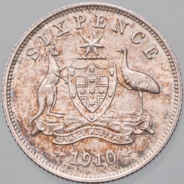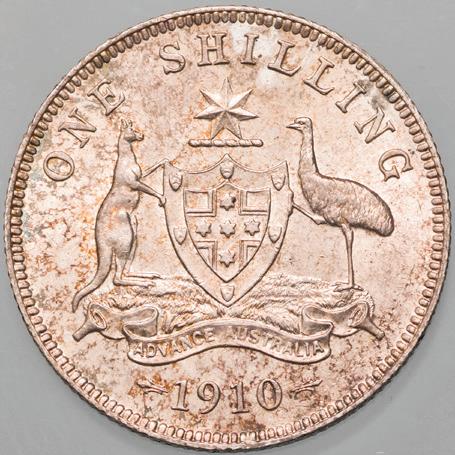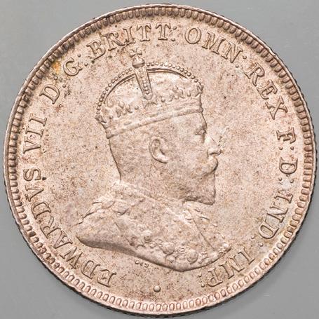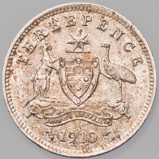 The only Australian Edward VII coinage issue, struck at the Royal Mint, London, the 1910 set comprises the sterling silver threepence, sixpence, shilling and florin. Notable for low mintages, a huge number of these coins have been lost or melted down. Of surviving examples, most are well worn. Rare in superior grade, they are seldom offered in the state of preservation seen here.