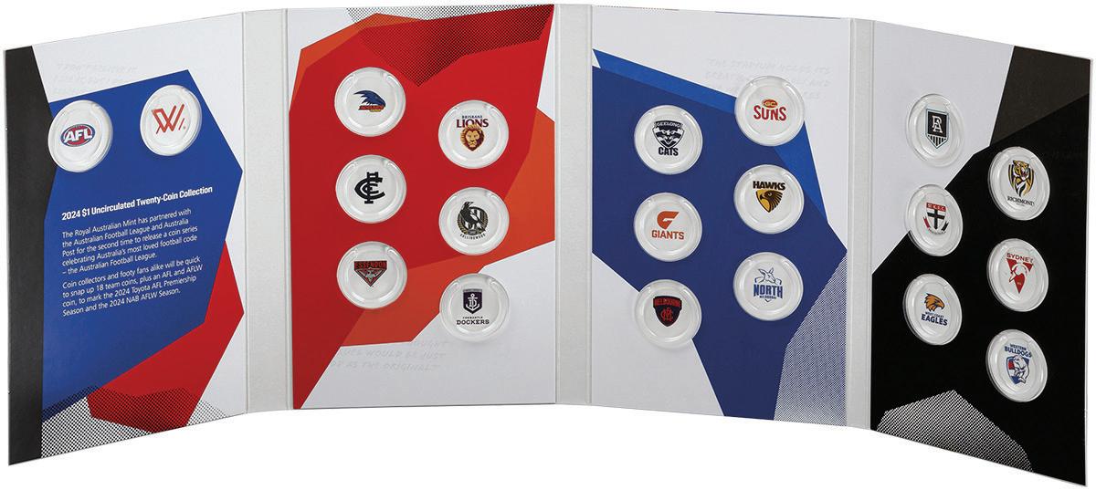 A RAM-Australia Post joint project, the officially licensed AFL 2024 $1 Collection comprises 20 $1 types – one for each AFL club, plus AFL & AFLW coins.