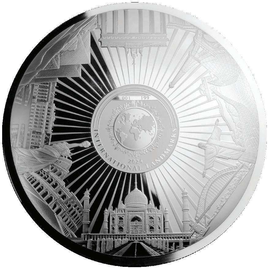 Struck in a concave/convex format from a whopping KILO of 99.9% silver, this huge 180mm coin celebrates the world’s greatest landmarks – Taj Mahal, Eiffel Tower, Statue of Liberty and more!