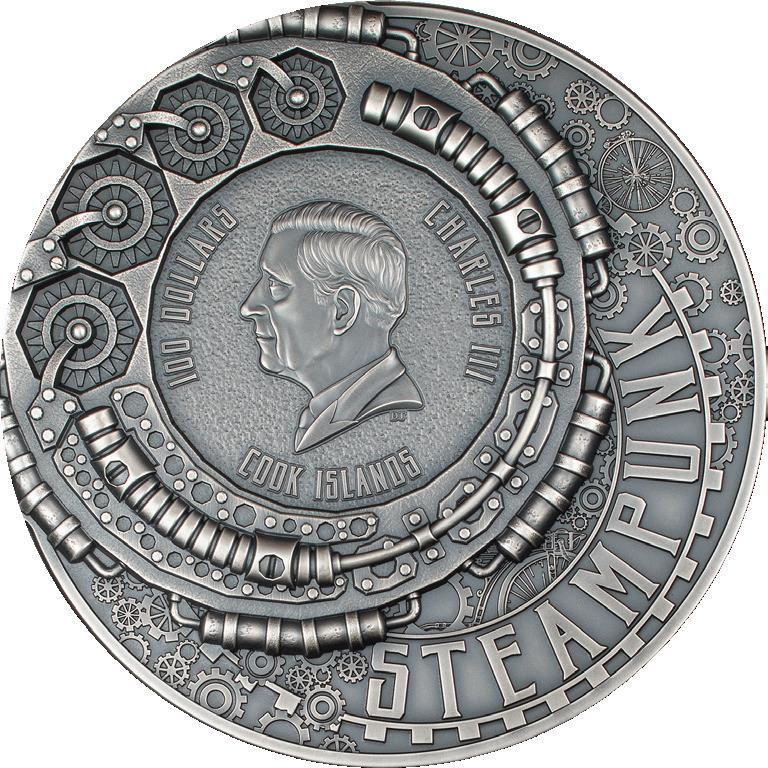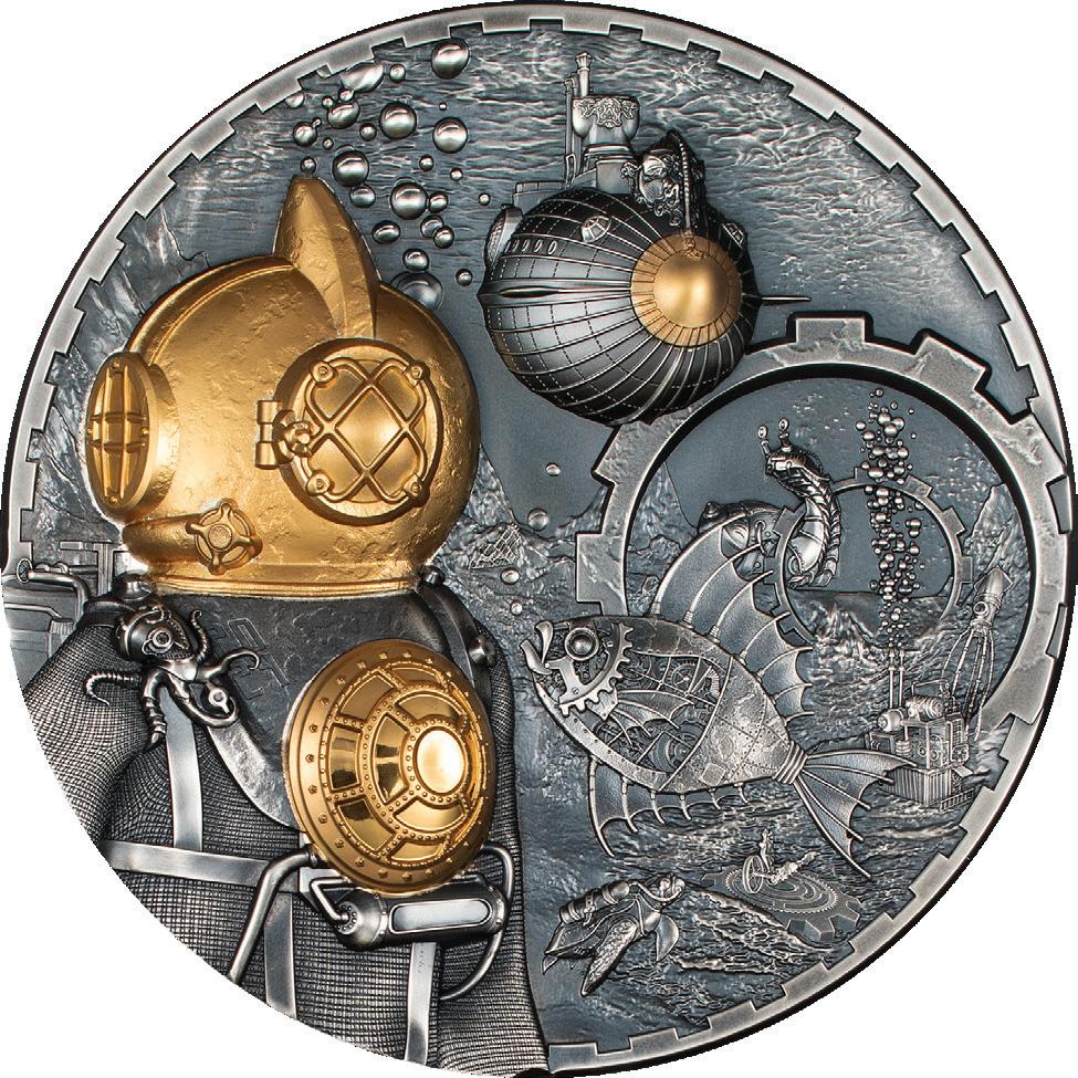 The third issue of the acclaimed Steampunk Series, this gargantuan legal tender coin forms a unique exploration of the underwater world of Jules Verne’s famous tale, Twenty Thousand Leagues Under the Seas.