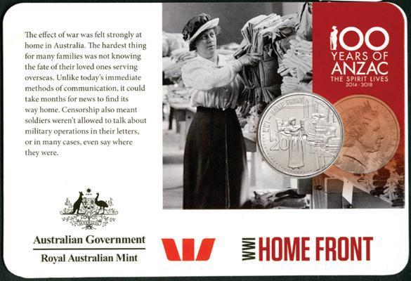 $15 Australia 100 Years of ANZAC 2015 20c Home Front Cupro-Nickel Uncirculated Coin