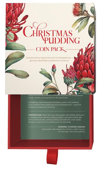 Beautifully presented in our all-new illustrated gift box, our Christmas Pudding Pack gives you the chance to maintain this longstanding Aussie Christmas tradition. And, with each bag comprising six threepences and three sixpences – dates of our choice – you can give anyone that missed out on a coin in the pudding one of the extras!