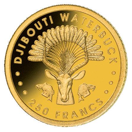 Struck from 0.5g of 14-carat gold, this tribute to the African waterbuck is a genuine legal tender issue: as with coins at right.