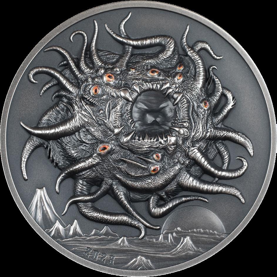 Honouring Azathoth – a ruling deity in the Cthulhu Mythos, created by famous US Gothic fantasy writer, H.P. Lovecraft – this Palau legal tender coin is a powerful, disturbing work of numismatic art.