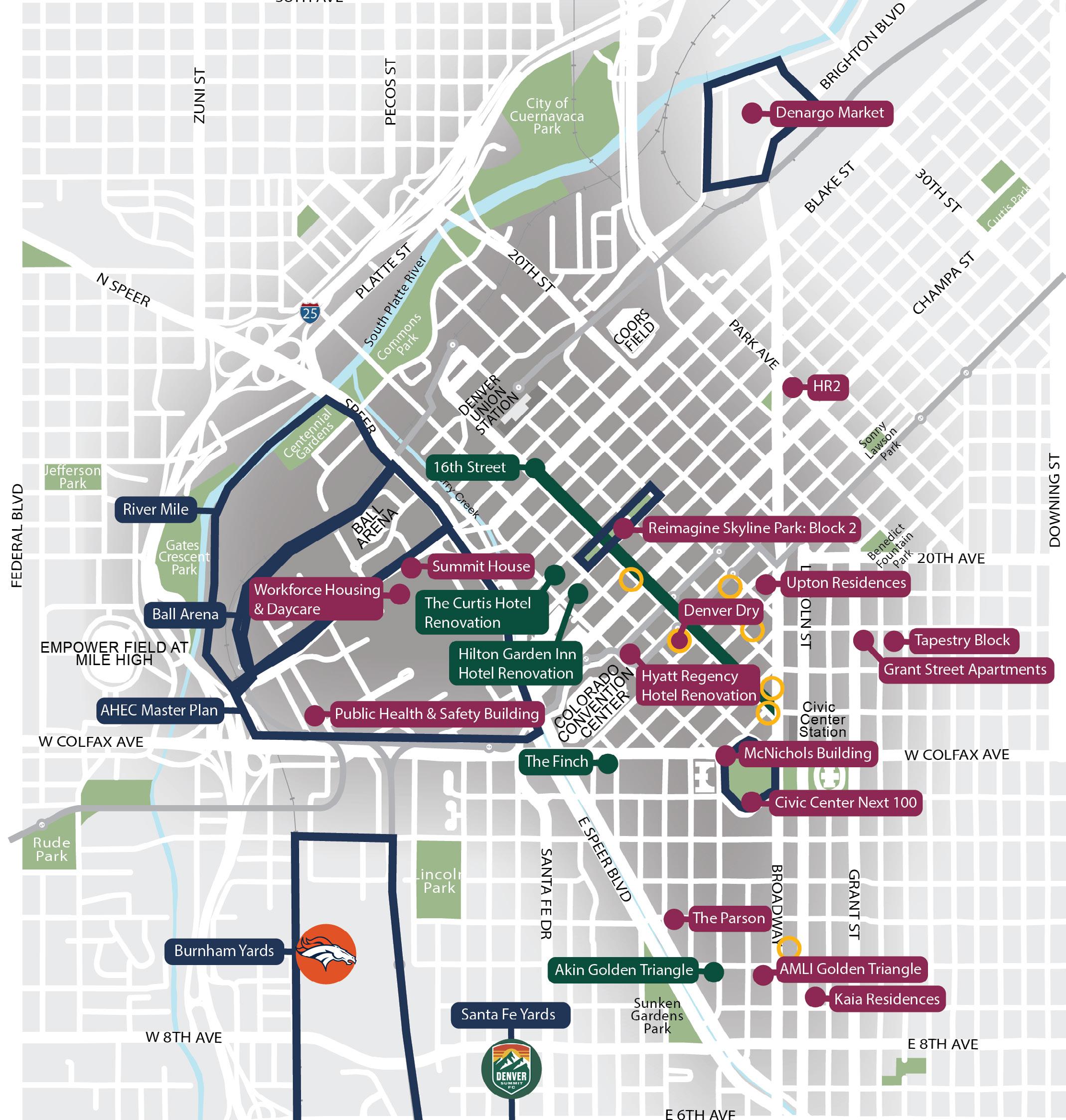 Seven projects, either approved for DDDA funding or in the pipeline, are expected to deliver approximately 1,800 residential units, including 300 affordable units, while removing an estimated 1.8 million square feet from downtown’s total office inventory. Together, these projects represent a deliberate strategy to rebalance supply and demand and advance a more complete, resilient urban neighborhood. Along with these pivotal moves, many major master plan projects are the process of finalizing designs. River Mile and Ball Arena are making progress and the Auraria Campus Master Plan broke ground on several projects this year. Although outside of downtown, projects like Denargo Market, Santa Fe Yards and Burnham Yards will have significant economic impact on downtown.