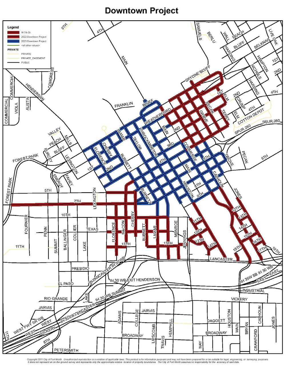 The City of Fort Worth completed an extensive $5.5 million Downtown paving project in 2023, which included resurfacing the asphalt streets and improving pedestrian crossings, sidewalks, and ramps.