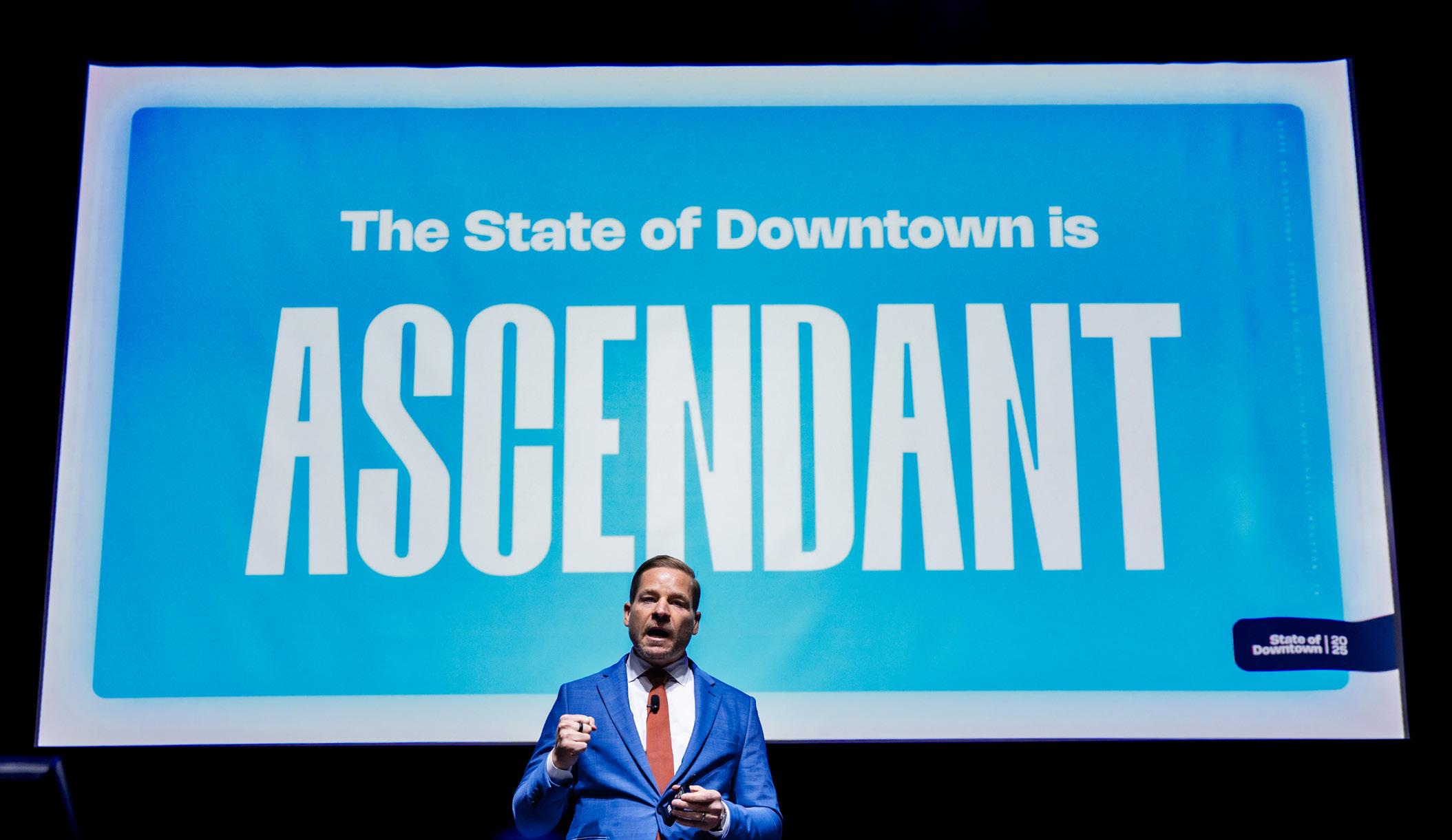 Business, elected, nonprofit leaders, press, and an all-star panel of professional sports luminaries joined an amped audience of almost 1,000 at 713 Music Hall to celebrate Downtown’s 2025 milestones:
