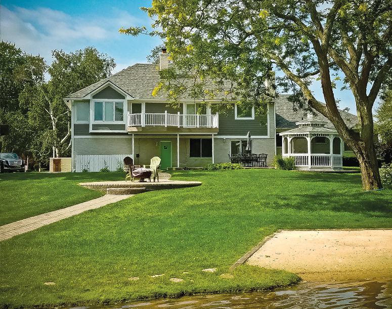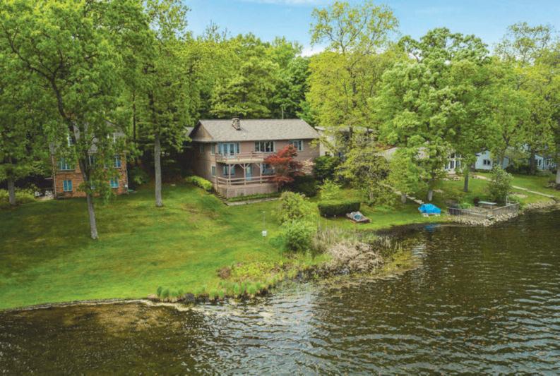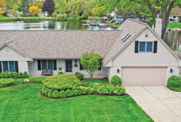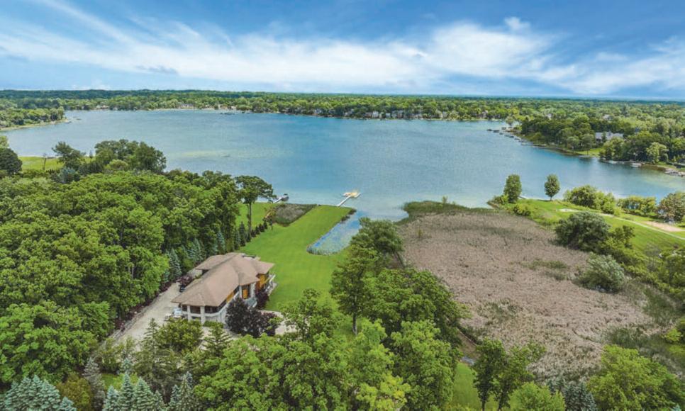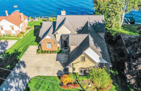 Brick beauty with 153’ of shoreline on private & pristine lake. 5,147 SF of living space features soaring ceilings, crown molding, granite and hardwood ooring! Great Room with replace and a wall of windows facing the lake, Dining Room with crown molding, French door Library. Island Kitchen/Nook are furnished with custom cabinetry, glass display, tile backsplash, SS appliances, door-wall leading to the deck and custom inlaid oor. 1st oor Owner’s Suite with replace, door-wall to the deck, 2 walk-in closets and jet tub Bath. LL walk-out includes a Family Room with replace and door-wall leading to the patio, Media Room, Wet Bar, Bedroom, Bath and Sauna! 1st oor Laundry and 3 Car Garage. $799,900