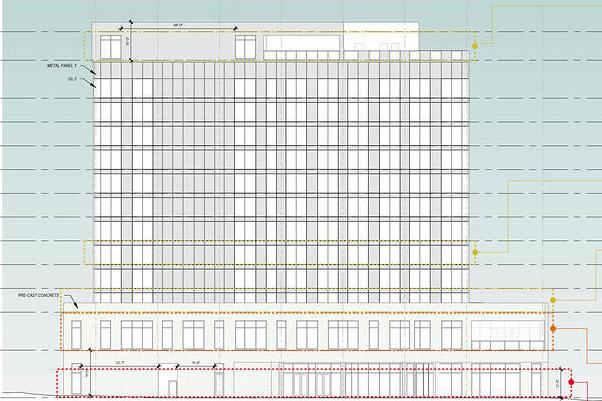 Recently filed plans indicate a second hotel is proposed on the site adjacent to the former Holiday Inn. The proposed 13-story hotel at 300 Hillsborough Street would include 180 rooms and a 2,500 square foot restaurant, while construction continues on the conversion of the former Holiday Inn into a 204-room Hotel Indigo.