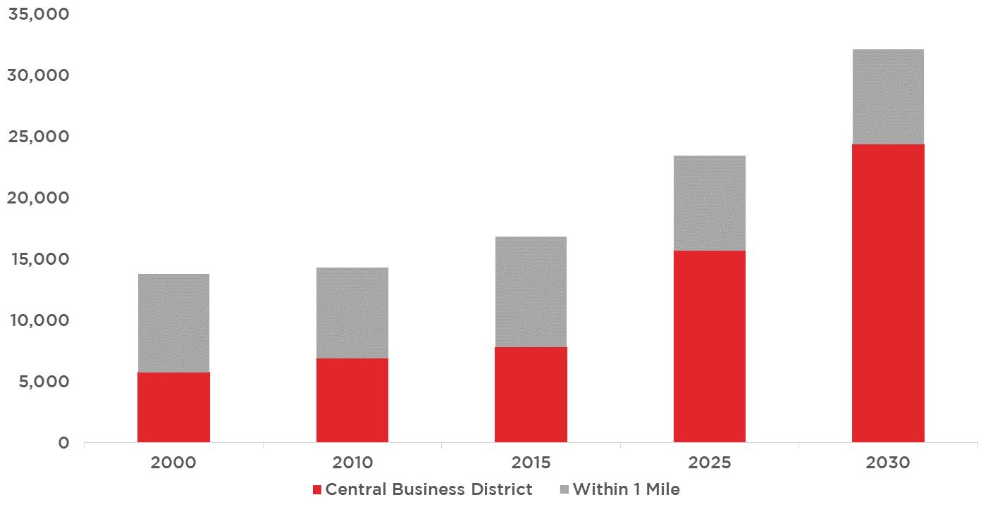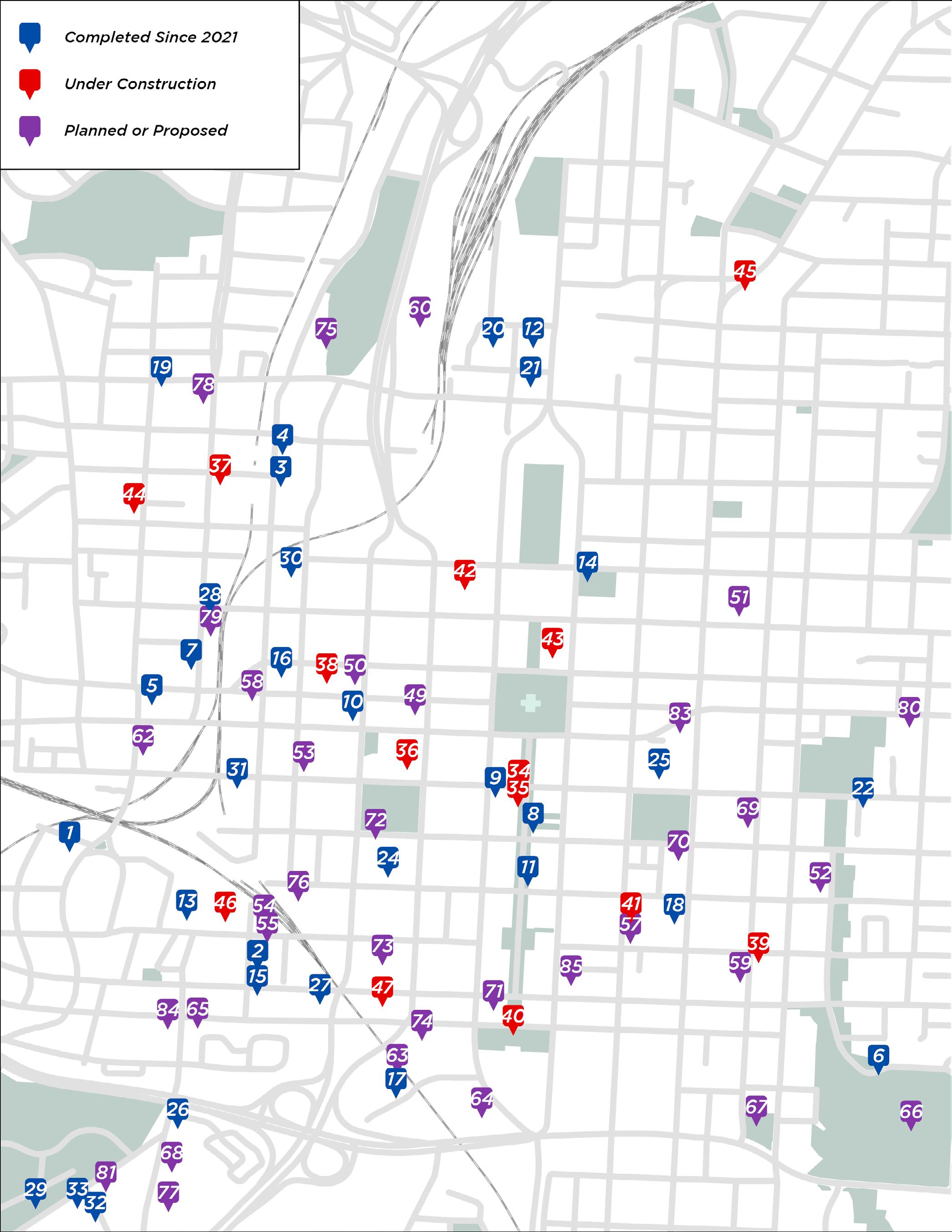 There are 14 developments under construction that will collectively deliver 611 residential units, 342 hotel rooms, and 56,500 square feet of storefront space upon completion.1 An additional 38 projects are currently in planning or have been proposed and, if completed, would deliver 6,342 residential units, 368,392 square feet of office space, 1,454 hotel rooms, and 256,124 square feet of retail.1