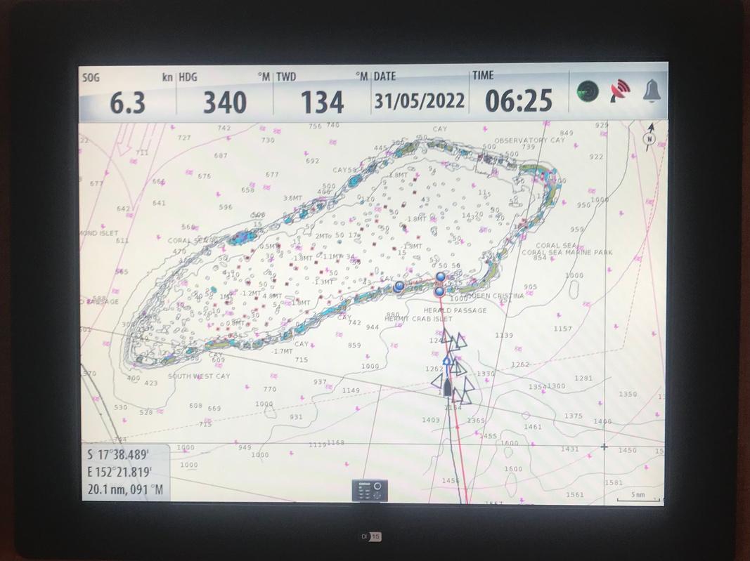Squally conditions persisted throughout Wednesday afternoon & evening at Lady Musgrave with consistent gusts between 25 & 30 knots Concerned that this would have made for more confused seas on the passage to Saumarez, we decided to remain at Musgrave and wait for the sea state to improve as the squalls move away The squally conditions persisted for most of the morning but became less frequent during the afternoon with a more consistent breeze of around 15-20 kts which was promising. The plan was to download the latest forecast early the following day and decide if we depart for Saumarez in the morning or wait until another day. The good news was that GOOLARA could rejoin the fleet at Musgrave, so all the ducks were in the pond and ready to depart when the conditions were a little less boisterous