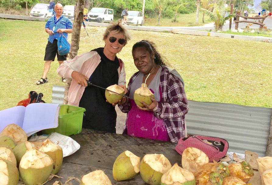 One of the many things I looked forward to as we sailed the Pacific Islands was enjoying refreshing coconut water. When exploring ashore, we would often idle away time trying to knock them from the heights of the coconut trees by using some of the discarded ones we found, never successfully, I might add, but some memories of the laughter that took place whilst trying stay with me.