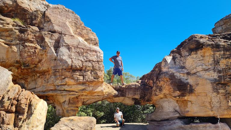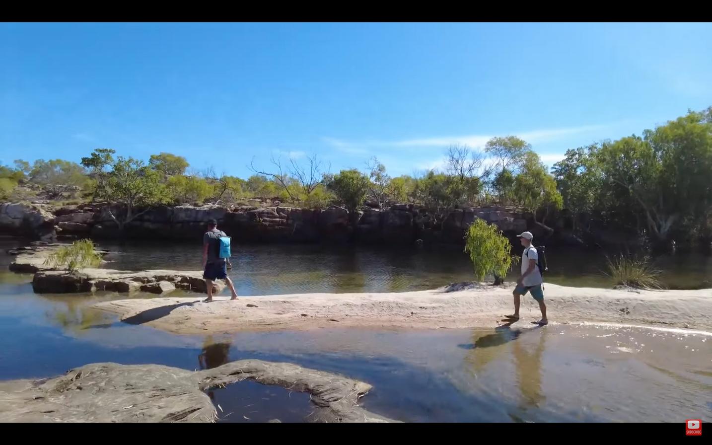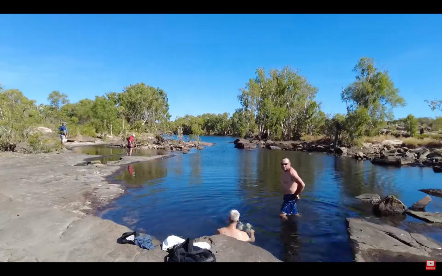 We found a shallower section where we could see the bottom, so it was time for a quick plunge to get to cool off a little before walking to the top of the billabong. At the top was a sandy island with fresh crocodile tracks, confirming why you cannot swim in this idyllic-looking pool. After walking across a shallow rocky shelf in the middle of the billabong, what appeared to be a log suddenly submerged. Luckily, it was only a small crocodile, but without a doubt, the larger crocs would have been watching us closely.