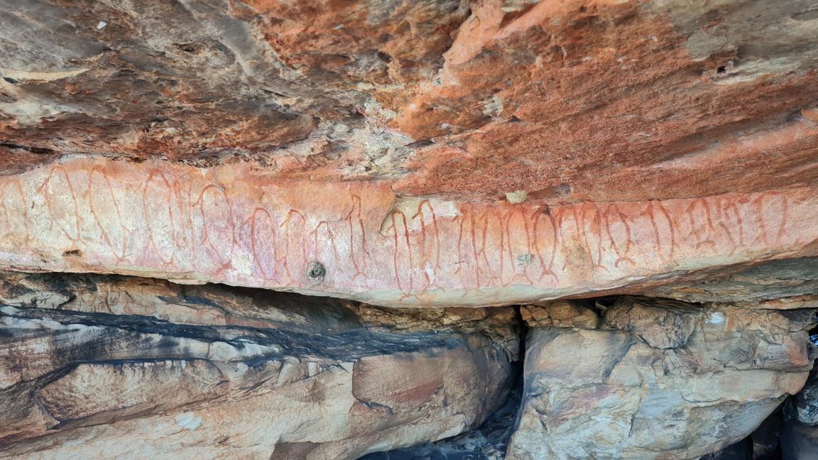 After working our way between rocks and up the very shallow muddy beach, through the overgrown scrub, we found the art site on the overhanging ledge with the huge snake artwork that is approximately 7 meters long.
