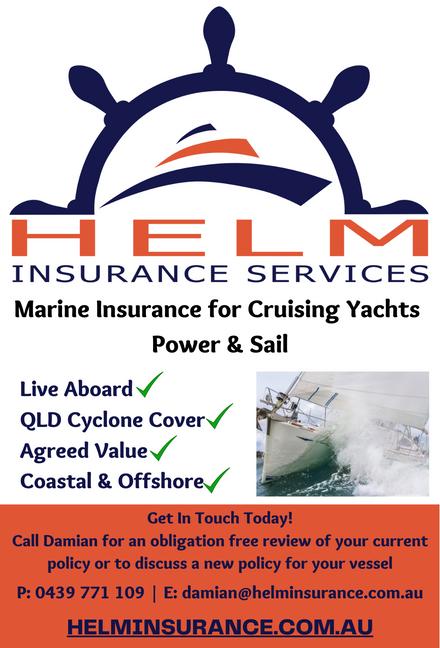 CRUISING YACHT MARINE INSURANCE CRUISING YACHT MARINE INSURANCE CRUISING YACHT MARINE INSURANCE Power & Sail Power & Sail Power & Sail SPECIALIST MARINE INSURANCE SPECIALIST MARINE INSURANCE SPECIALIST MARINE INSURANCE BROKERAGE BY BOATIES BROKERAGE BY BOATIES BROKERAGE BY FOR BOATIES FOR BOATIES FOR BOATIES P: 0439 771 109 | E: damian@helminsurance.com.au HELMINSURANCE.COM.AU Get In Touch Today! Call Damian for an obligation free review of your current policy or to discuss a new policy for your vessel Live Aboard QLD Cyclone Cover Agreed Value Coastal & Offshore