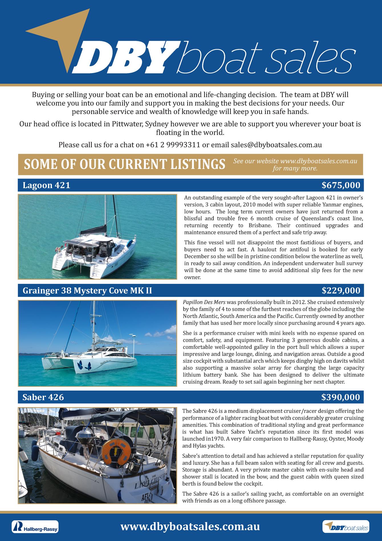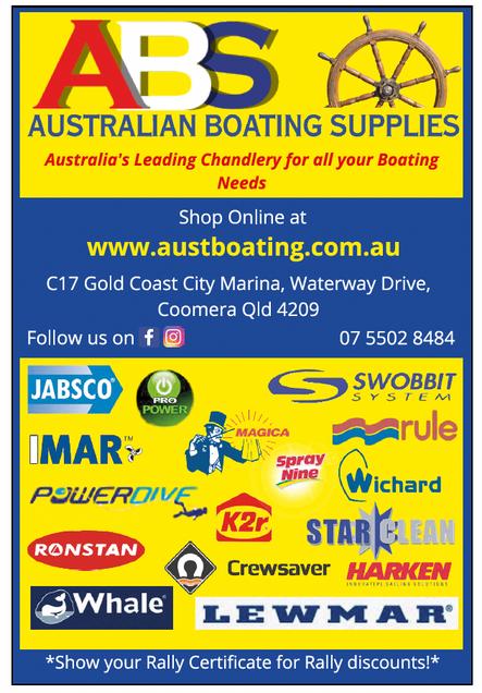 DaveandHelenbroughtAustralianBoatingSupplies(ABS)about15yearsago whenitwaslocated atthefrontofGoldCoastCityMarina,partofthe GoldCoastMarinePrecinct.Sincethentheyexpandedto shedF31,andagainintoshedC17whichisrightnexttotheboomgatesandhassubstantiallyincreasedthe rangeofboatingandmarineproducts. HavingraisedtheirfamilyinCanberra,theymovedtoQueensland,purchasedthechandleryandTropical SunsetaSeawind1160andboatingbecamealargepartofthefamily'slives. FormanyyearsDave,Helen,Danielle,MichaelandEmmaholidayedandsailedbetweentheGoldCoastand farnorthQueenslandonTropicalSunset.Duringthistimetheytriedandtestedmanyoftheproducts currentlystockedintheshopandcanprovideadviceandknowledgebasedontheirownexperience. REMEMBER GOOD OLD-FASHIONED SERVICE? The Hutcheson family and the staff at ABS have extensive boating experience and really do enjoy helping you with your chandlery needs. We look forward to welcoming you IN-STORE Monday to Friday 8 AM – 4:30 PM Saturday 8:30 AM -12:00 PM, OR by phone or online when it suits you That is what you will find at our chandlery, Australian Boating Supplies. C17 Gold Coast City Marina, 76 84 Waterway Drive, Coomera Qld 4209 AUSTBOATING.COM.AU PHONE: 07 5502 8484 DOWN UNDER RALLY MEMBERS RECEIVE GENUINE DISCOUNTS OFF ALL ITEMS IN-STORE, EXCLUDING ITEMS ALREADY ON SALE AND AS SUCH ALREADY DISCOUNTED.