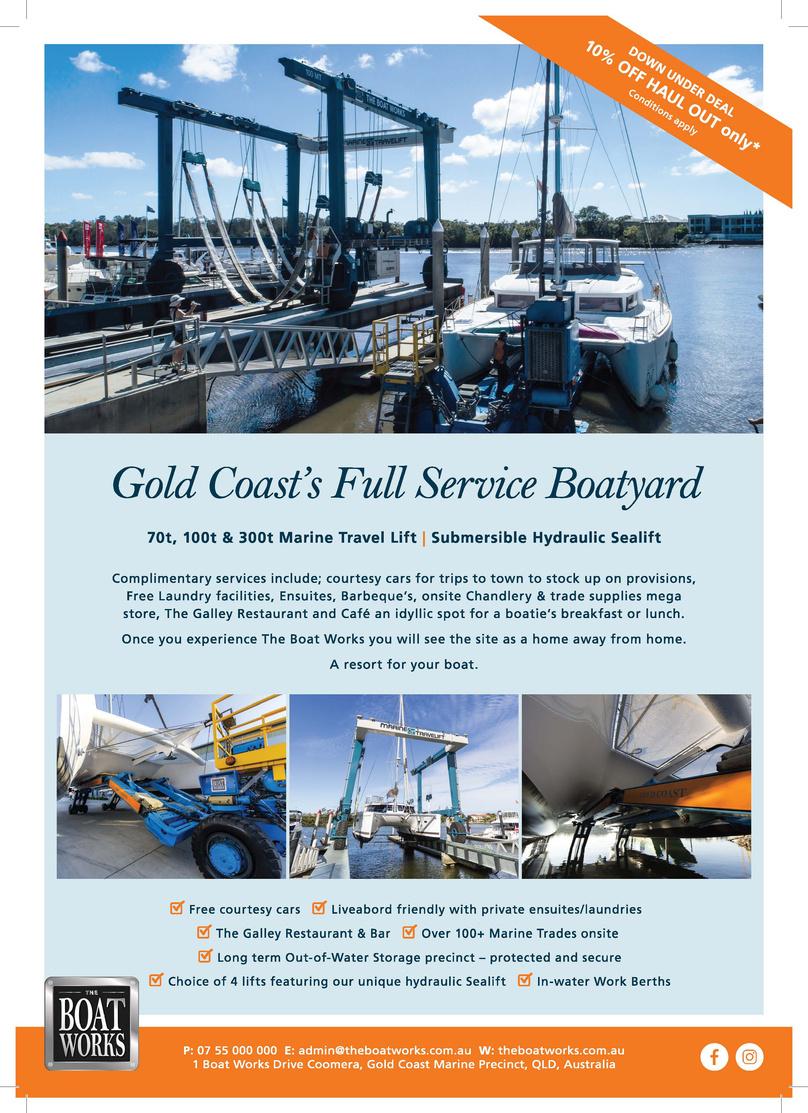 Conditionsapply 10%OFFAnnualLift* (07) 55 000 000 admin@theboatworks com au theboatworks.com.au Coomera, Gold Coast Where you can choose to work on your own boat, engage specialist marine trades, or appoint a project manager to coordinate everything on your behalf. TheChoiceisYours DownUnderRally Membersreceive
