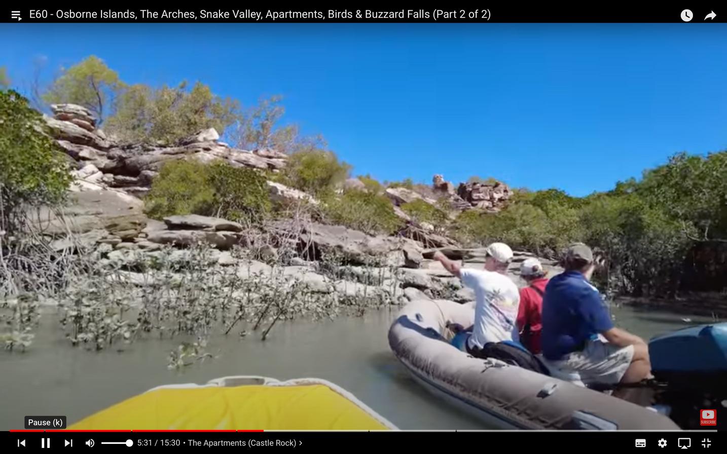 After checking out the birds, the tide had risen sufficiently to get out tender over the further obstructing rocks at the rock bar, and around into more of a dry flat rock lagoon that was filling with the incoming tide. Placing our anchor high to keep it out of the water and allow for the incoming tide would permit us to retrieve our tender without getting in the water, where a crocodile could be watching our every move. We climbed over the incredible jagged weathered rocks, making our way up the creek in search of the falls and freshwater swimming holes.