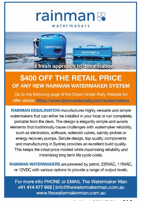 Members Marketplace Rainman Water Maker- NEVER BEEN USED. DownUnderRallyMembersareinvitedtolisttheir*unwanteditemsforsaleinourAHOY! Tolistyouritemoritemsinthemembersmarketplace:Emailphotos/description/price&contact informationtoadmin@downunderrallycom FREEFORDOWNUNDERRALLYMEMBERS *Itemsofferedmustbeusedequipment/personalitemsrelatedtosailing&cruisingNoboatsforsalelistings,please(Tendersok) High capacity 240 v AC unit with dual membranes. Purchased NEW in December 2021 when planning to go to Fiji, but in the end, we didn't go. As a result, we were never more than two weeks from a marina and water, so it didn't get used. The asking price is $7000 AU. ($1000 off the current New Price.) I'm currently cruising in FNQ and will be back in Airlie Beach in early December with regards to pick up or shipping. Contact Colin Budich 0425737301 budich@telstra.com NORTHERN LIGHTS GENERATOR 9kva @ 110v| 7kva @ 240v. Complete wiring loom, gauges & sound proof box. 4500hrs recently serviced and in good working order when removed. $2000.00 ONO. Ph Glen Thomson 0406 512 916. WALDER BOOM BRAKE. Slows and controls the boom during a gybe. This one ex a 47-foot yacht. We are building a solid dodger, and there will be no room under the boom for it. Asking $400. These are over $1200 new. Get more info about them HERE We are in Fremantle. I can post at your cost. TO ENQUIRE CONTACT MARTIN: 0400 837 157