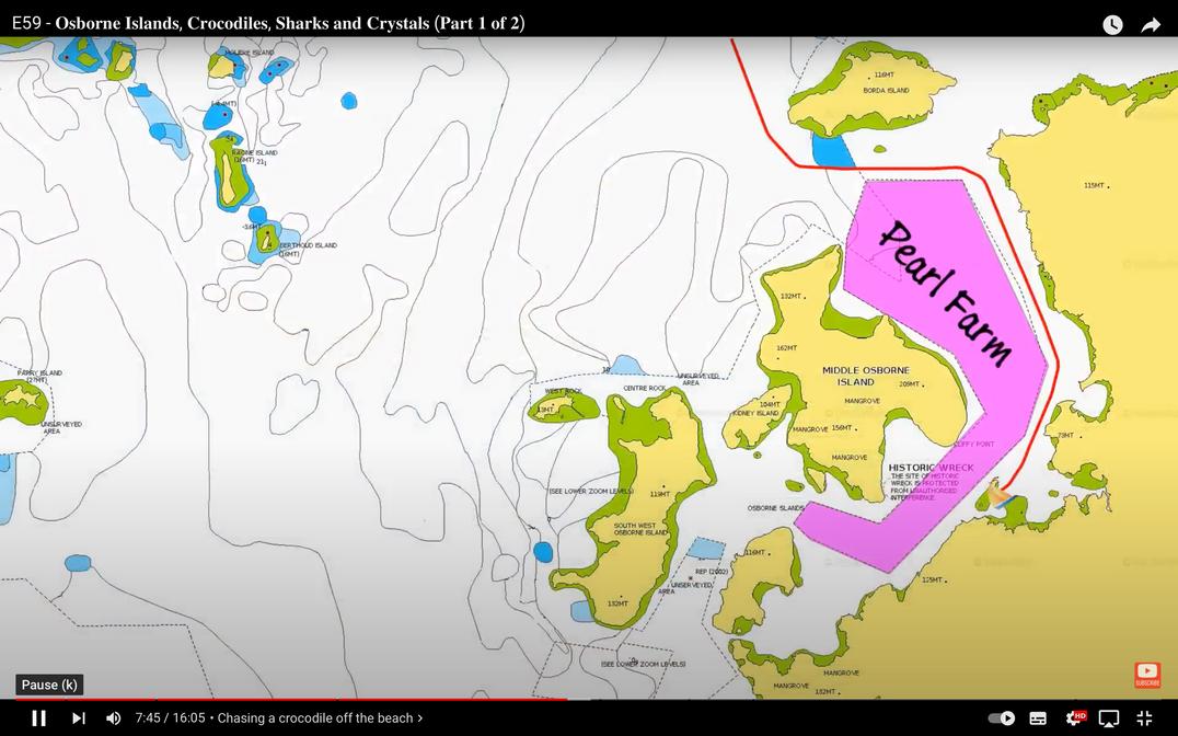 There are a significant number of pearl farms located around the Osborne Islands and you must keep clear. Thankfully, they are very well maintained and there are yellow boundary markers that show up very well on the radar, with them also very closely positioned to the Navionics charts. These pearl farms do, however, take up a significant portion of the waterway, and you skirt around the edges of them.
